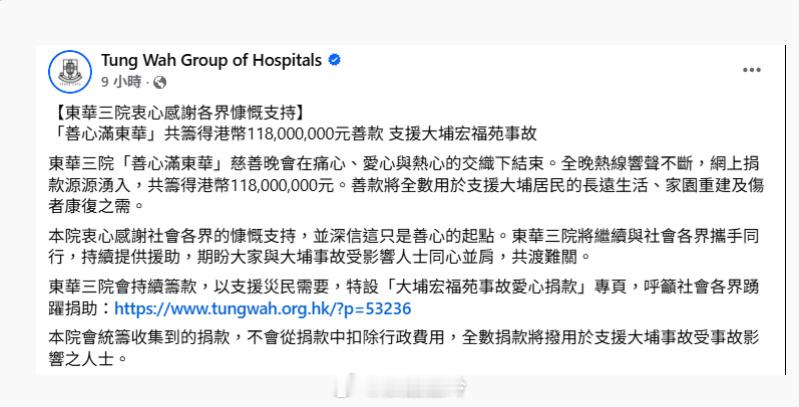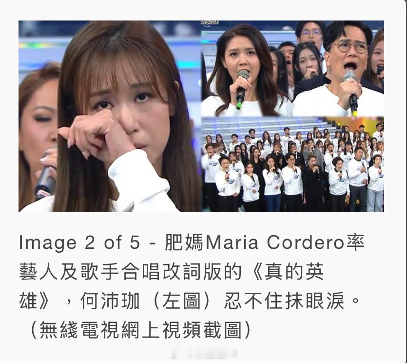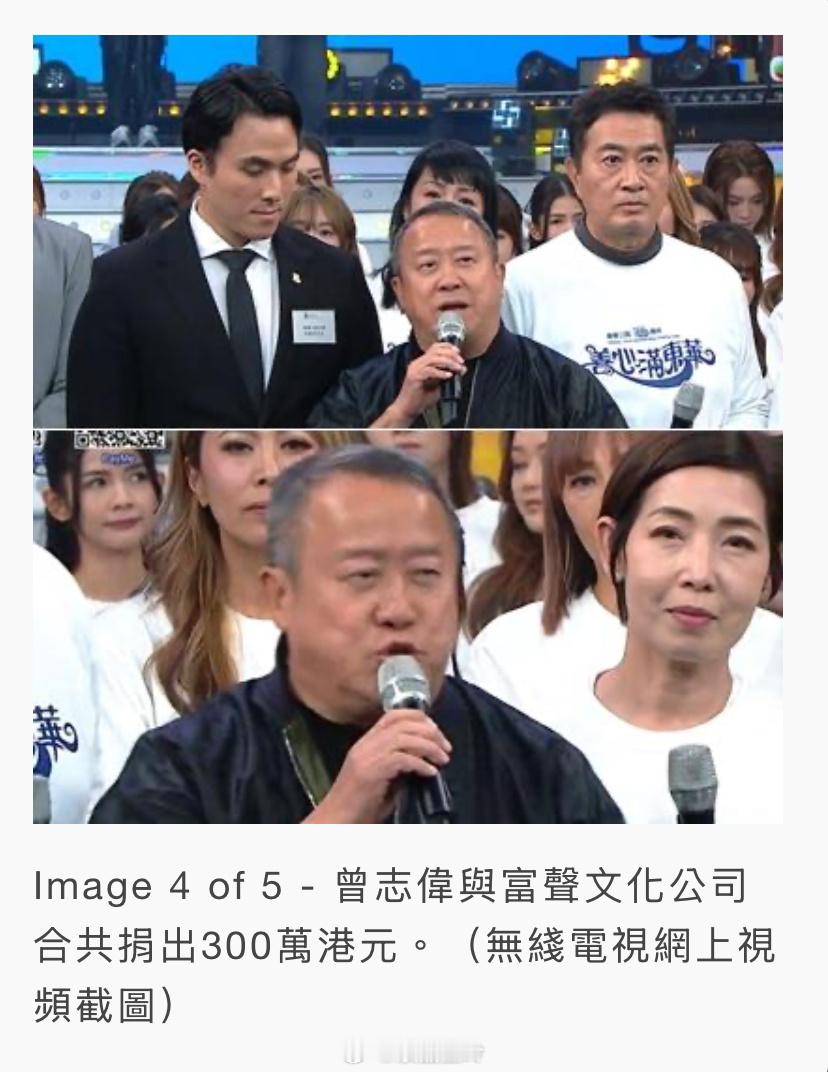 【明報即時】《東華》共籌1億1800萬善款 曾志偉捐300萬 肥媽帶淚領唱肥媽Maria Cordero率藝人及歌手合唱改詞版的《真的英雄》,何沛珈(左圖)忍不住抹眼淚。(無綫電視網上視頻截圖)TVB慈善節目《善心滿東華》昨晚(29日)在電視城舉行,在晚間新聞之前,善款數字為$9,7055,407,無綫總經理曾志偉在大合唱後現身,他表示略盡綿力,與富聲文化公司合共捐出300萬港元,令善款數字推到1億,該時段的善款數字為$100,055,407。而整晚《善心滿東華》籌得的總善款為港幣$118,000,000元,以支援大埔宏福苑事故,東華三院的社交平台專頁亦貼出善款總數。另外,在曾志偉現身前,肥媽Maria Cordero率藝人及歌手合唱改詞版的《真的英雄》,向前線救人英雄及為出心出力的市民致敬,司儀鄧梓峰和區永權也強忍淚水,何沛珈忍不住拭淚,肥媽亦唱到落淚,獻唱期間她邊唱邊抹眼淚。(即時娛樂)