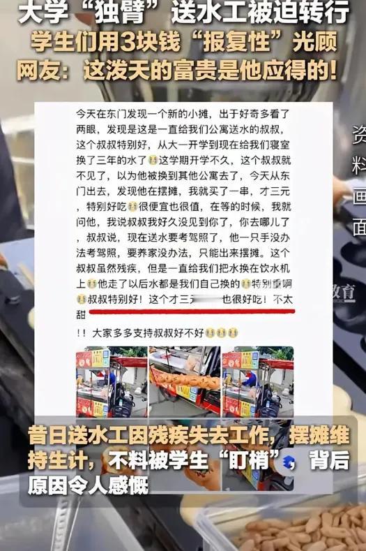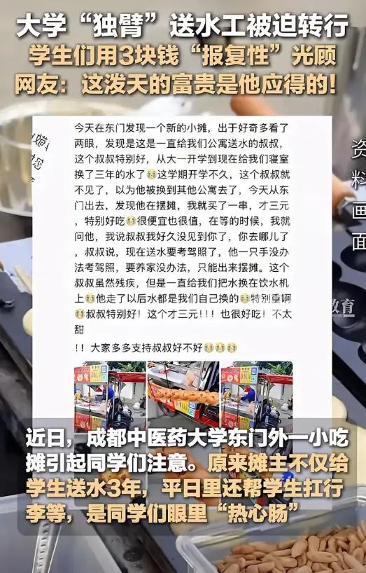 这哪是摆摊?这是成都中医药大学最硬核的招生简章!最近,校门口55岁的独臂黄大叔彻底火了。一只手、一口锅、3元一串的串串糕,摊位前学生排队到晚上11点,队伍长得能绕半圈操场。 大叔曾是学校的送水工,因右手残疾考不了驾照丢了工作。摆摊第一天只卖3串,直到学生认出他。这不是帮我们搬行李的叔叔吗?一条帖子炸出全校记忆!原来大家都记得他单手扛水桶爬楼,顺手帮女生扛行李的样子。 着迸发出了双向奔赴的温情。学生建了500人微信群通报出摊时间,多付钱备注不用找零,默默帮忙摆餐具。大叔承诺永不涨价,他们对我好,我得对得起良心。有人感慨!这哪是买糕?是给曾经的善意续费。 比起流量炒作,这场静默的守护更像一堂公开课。善良不必喧哗,尊严无需打折。有网友调侃这波操作,比学校官网招生简章好使! 如今,小摊成了情感枢纽。有人说,3元串串糕嚼出了人情味。它甜过红糖,暖过寒冬里任何一句口号。