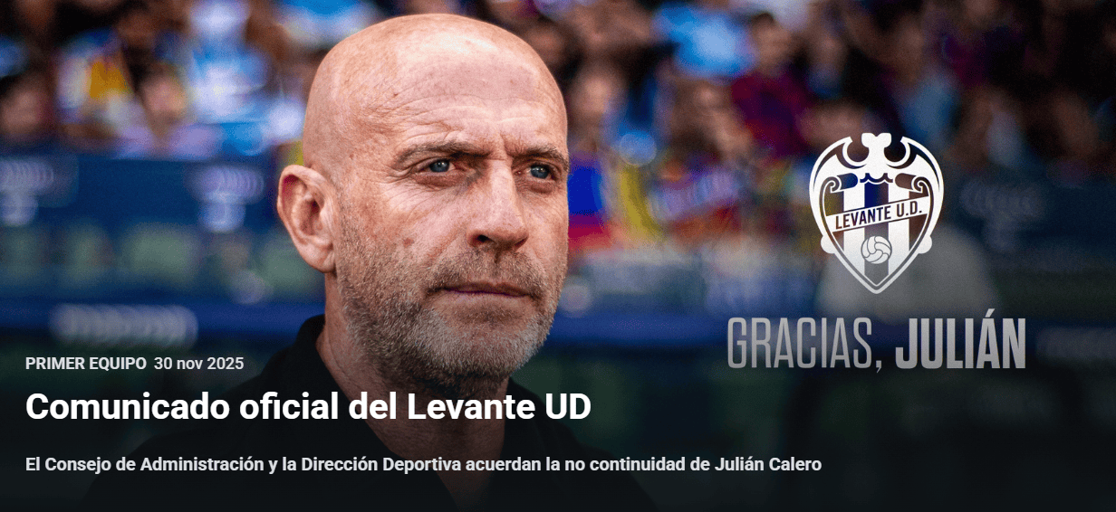 莱万特足球俱乐部谨向胡利安-卡莱罗及其教练团队——体能教练罗伯托-奥韦赫罗、守门员教练博尔哈-蒙特罗——致以最诚挚的谢意,感谢他们的不懈付出、全心投入、坚定执着与深度参与,更感谢他们为莱万特社群重塑信念。我们衷心祝愿他们未来的职业道路一帆风顺、前程似锦。