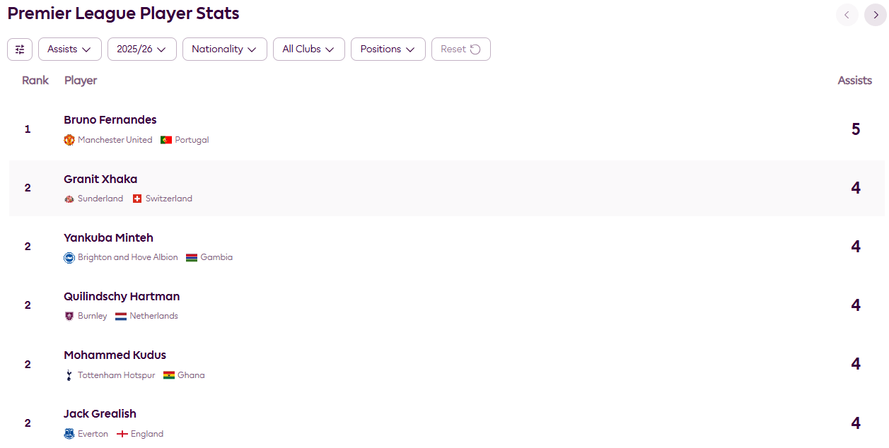据统计,布鲁诺-费尔南德斯在本赛季13轮英超比赛中送出5次助攻,目前暂列英超助攻榜首位。在B费身后的球员包括扎卡、明特、哈特曼、库杜斯和格拉利什。