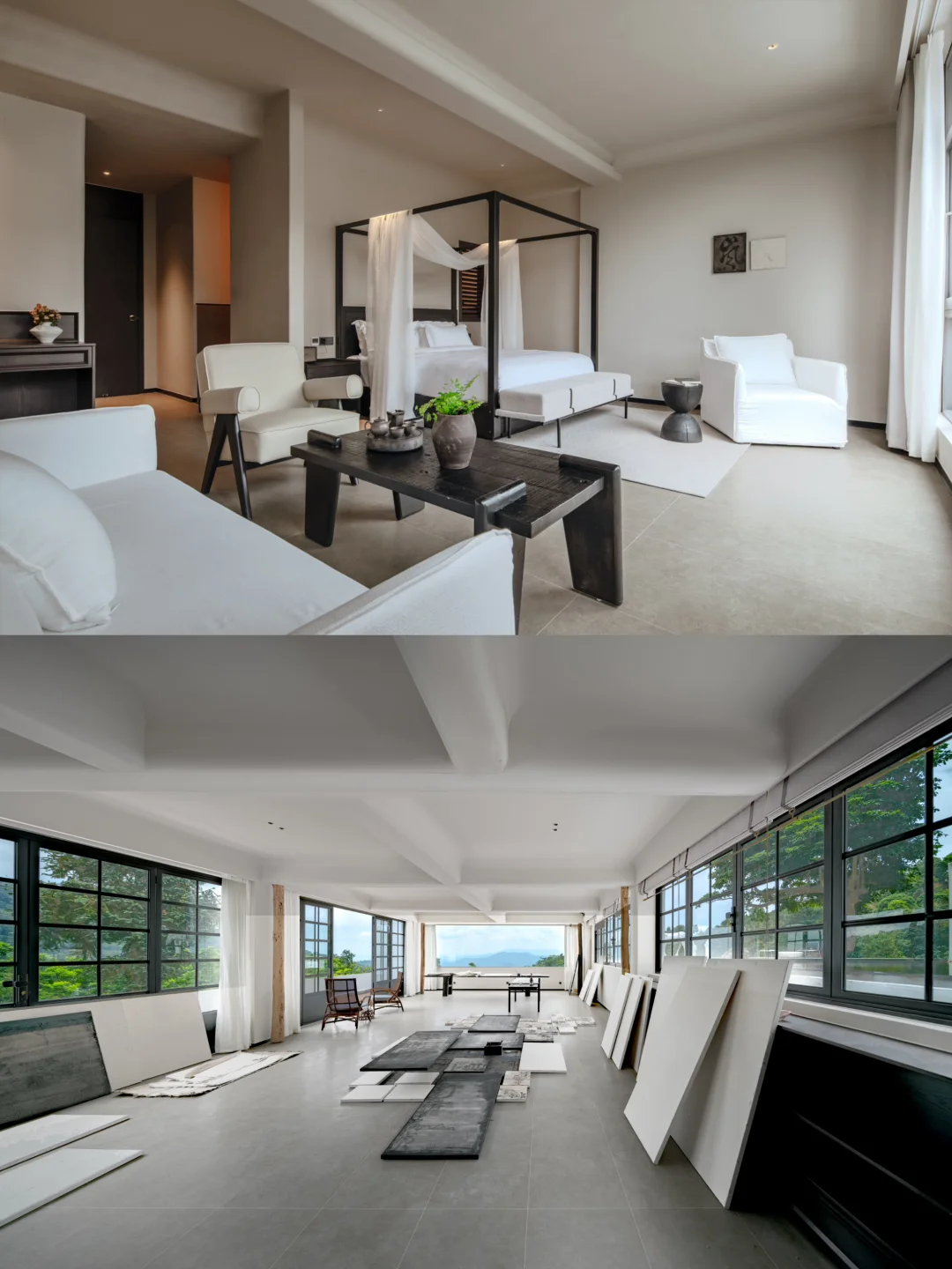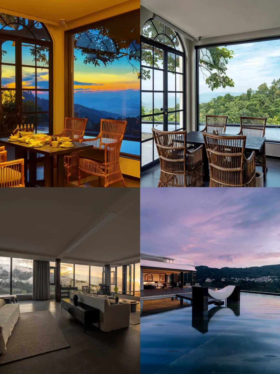 🌟现代侘寂风碰撞雨林野趣,270°落地窗框住尽览山色。