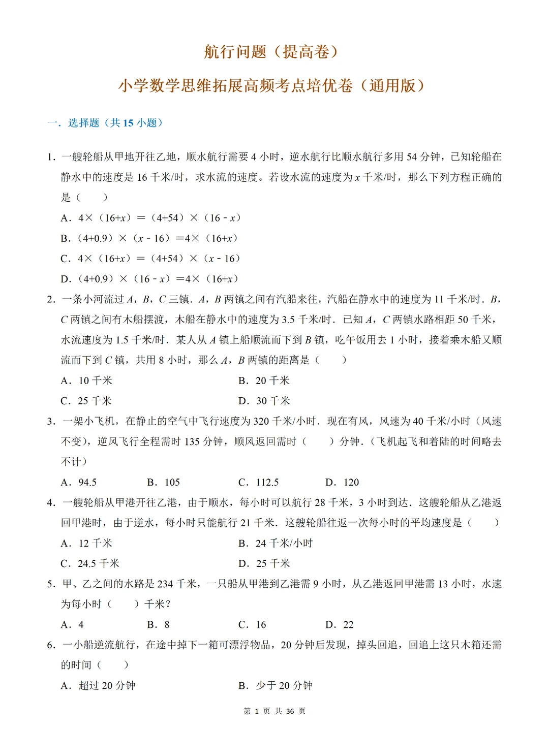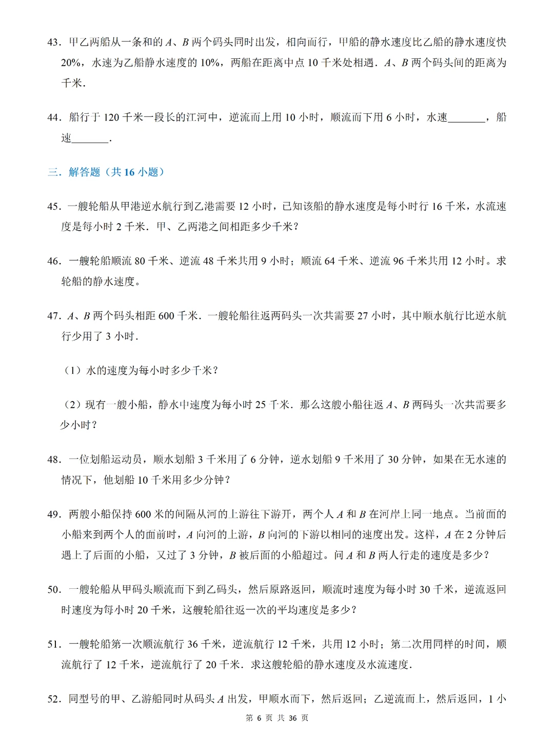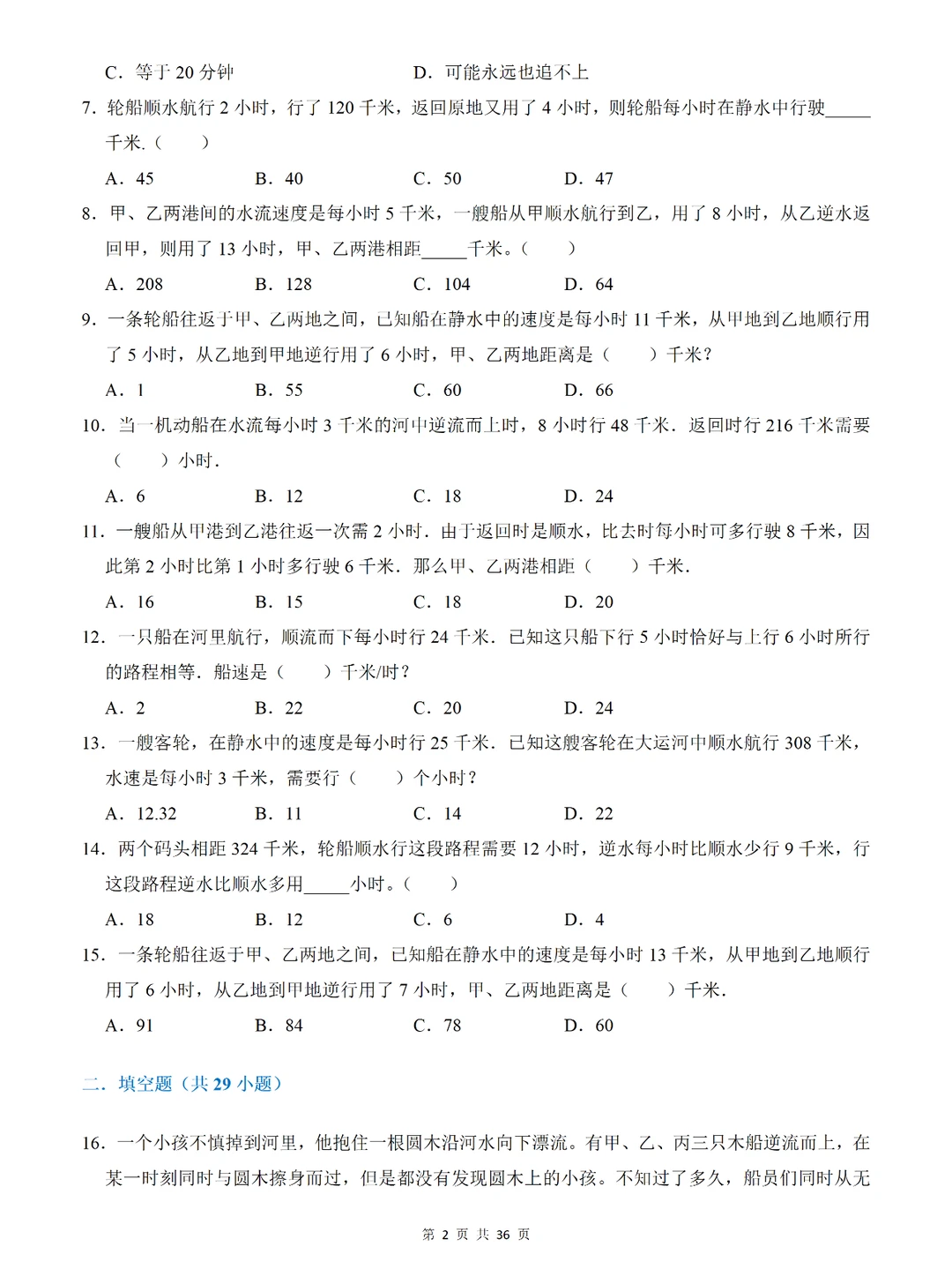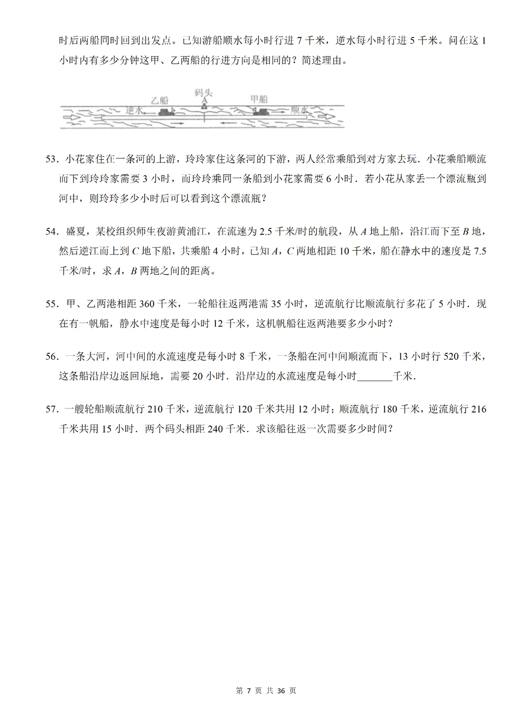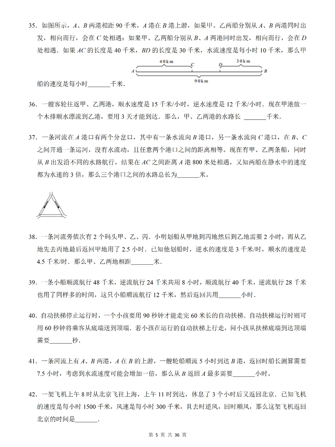 🌈解答航行问题类的应用题时,首先要熟练掌握航行问题中的所有公式,特别是顺水和逆水公式是重中之重,同时抓住两码头之间距离不变,水流和船速不变的特点来考虑问题!数量关系如下: 1️⃣(顺水速度+逆水速度)÷2=船速 2️⃣(顺水速度-逆水速度)÷2=水速 3️⃣顺水速=船速×2-逆水速=逆水速+水速×2 4️⃣逆水速=船速×2-顺水速=顺水速-水速×2