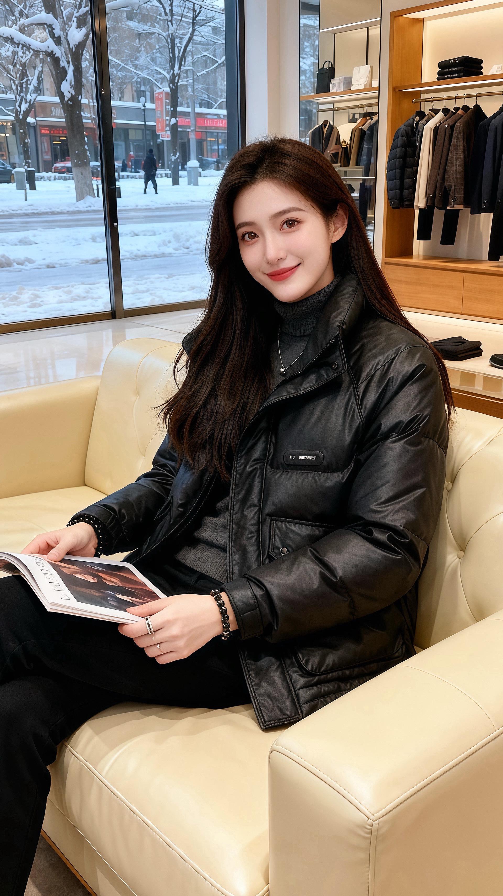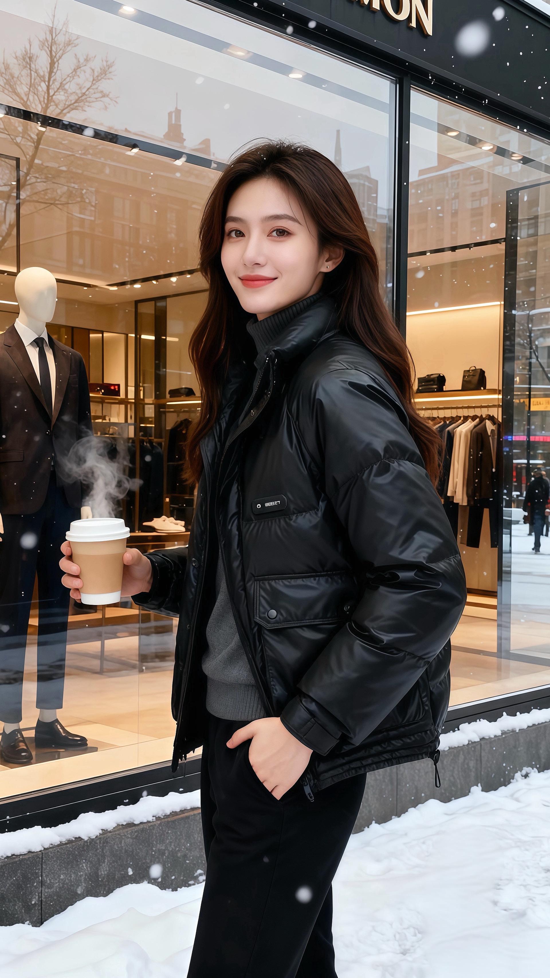 “你穿这件,比模特顺眼。”他推开门时,雪片沾在她发梢。苏晓转过来笑,外套的线条顺着肩背坠出松弛的弧度,像把冬风都裹成了软的。