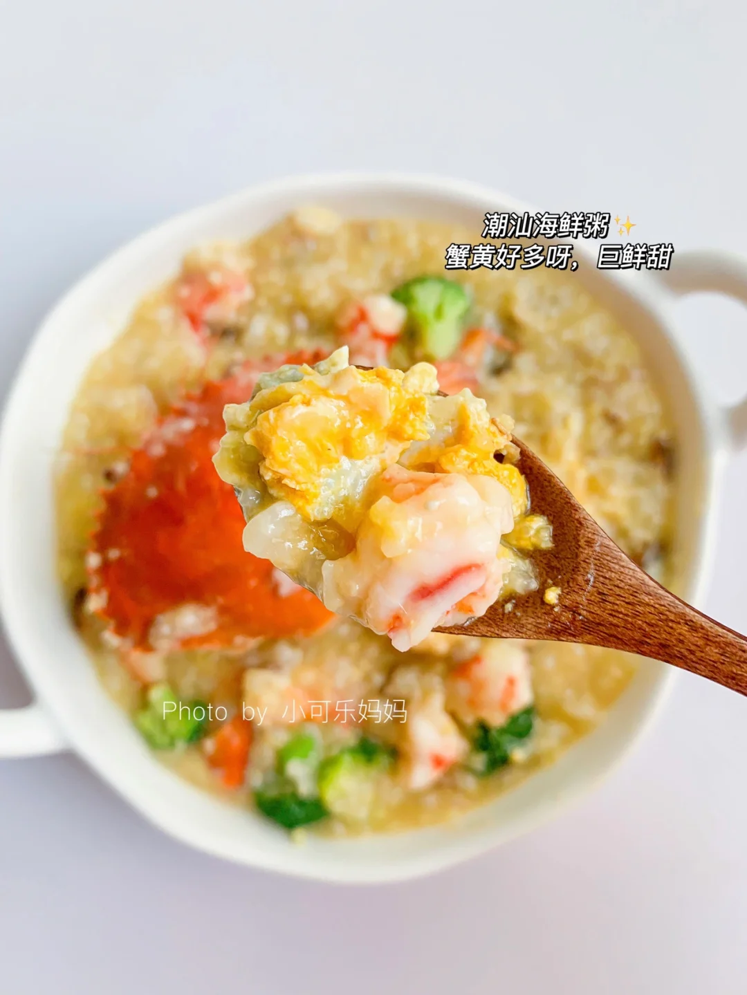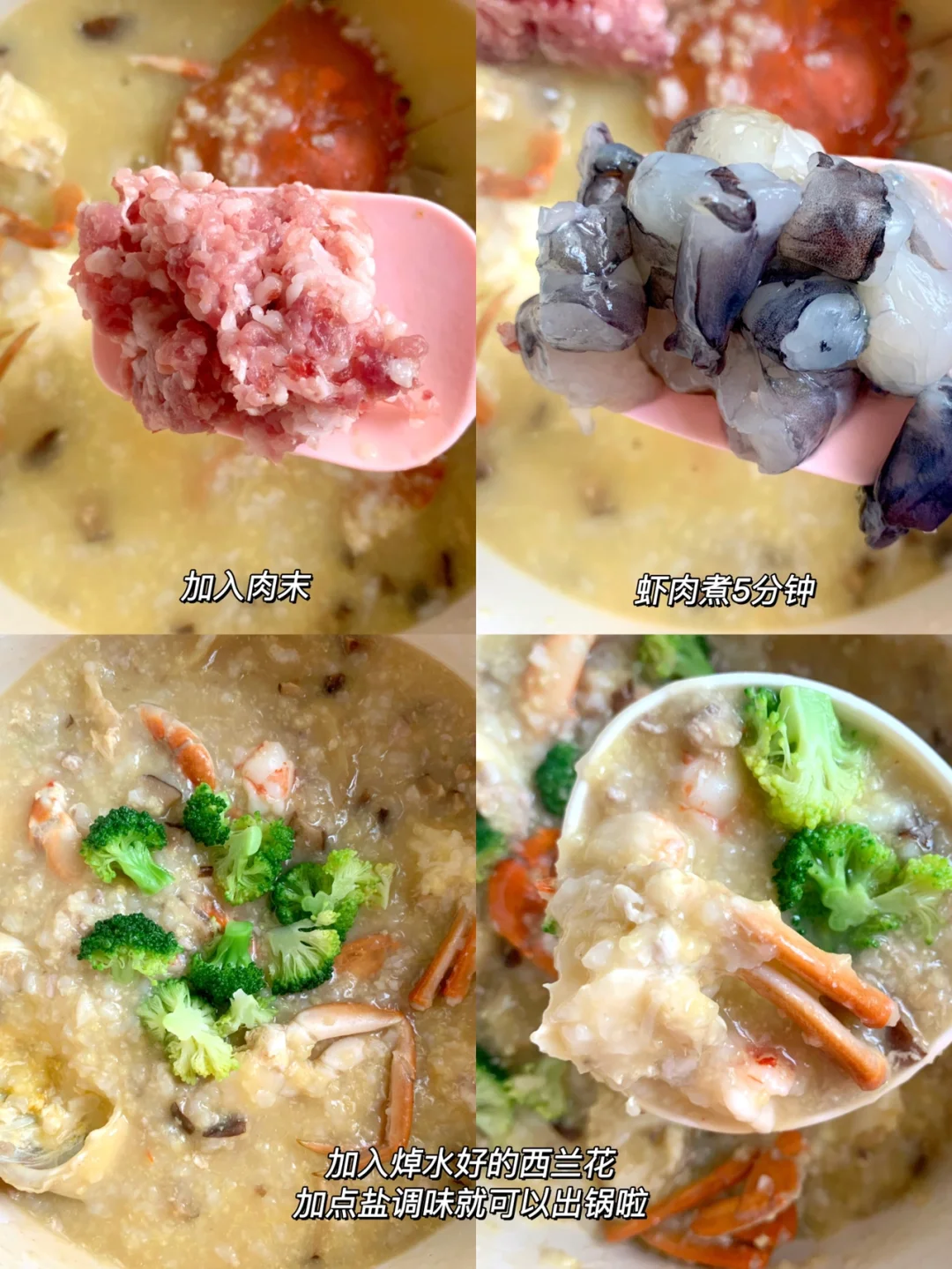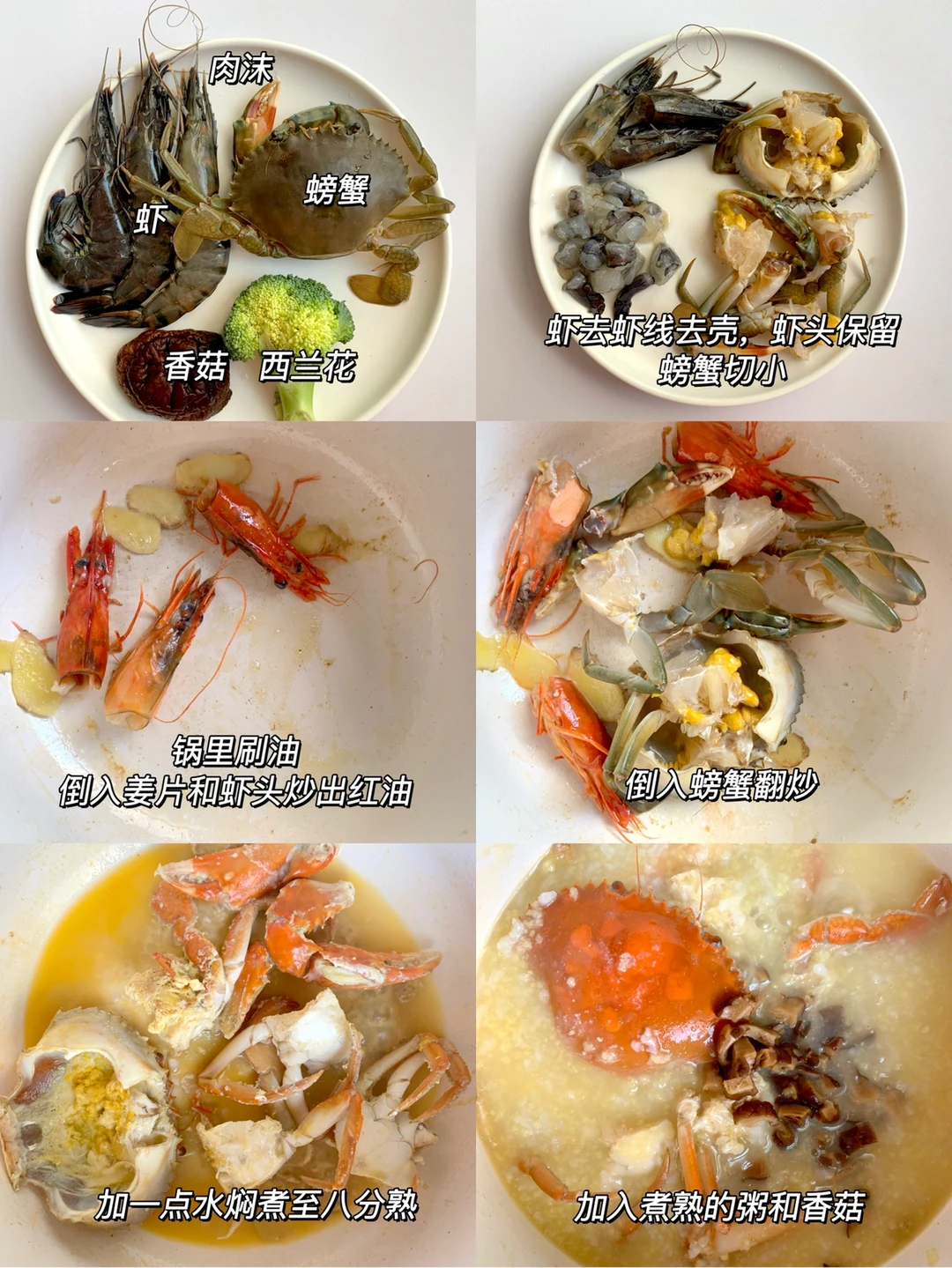 喝过那么多粥,还是最馋这口海鲜的鲜甜,鲜倒掉眉,做法也很简单。天气渐凉,日常多煮些营养粥营养又养胃。[飞吻R][飞吻R] - 🌟食材 螃蟹、鲜虾、肉末、西兰花、香菇 . 🌟做法 1⃣️螃蟹洗干净切小块,虾去壳去虾线切小,(虾头保留)香菇切小 2⃣️锅里刷油,倒入姜片和虾肉翻炒出红油,倒入螃蟹翻炒,加入少许水焖煮八分熟 3⃣️倒入煮好的粥、香菇、肉沫和虾肉煮熟,再加入焯水好的西兰花即可