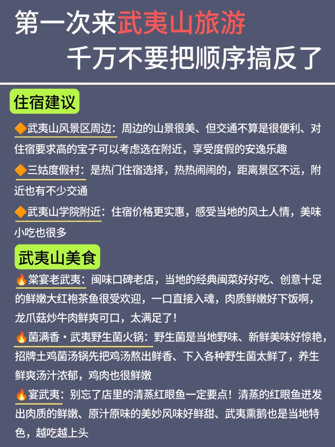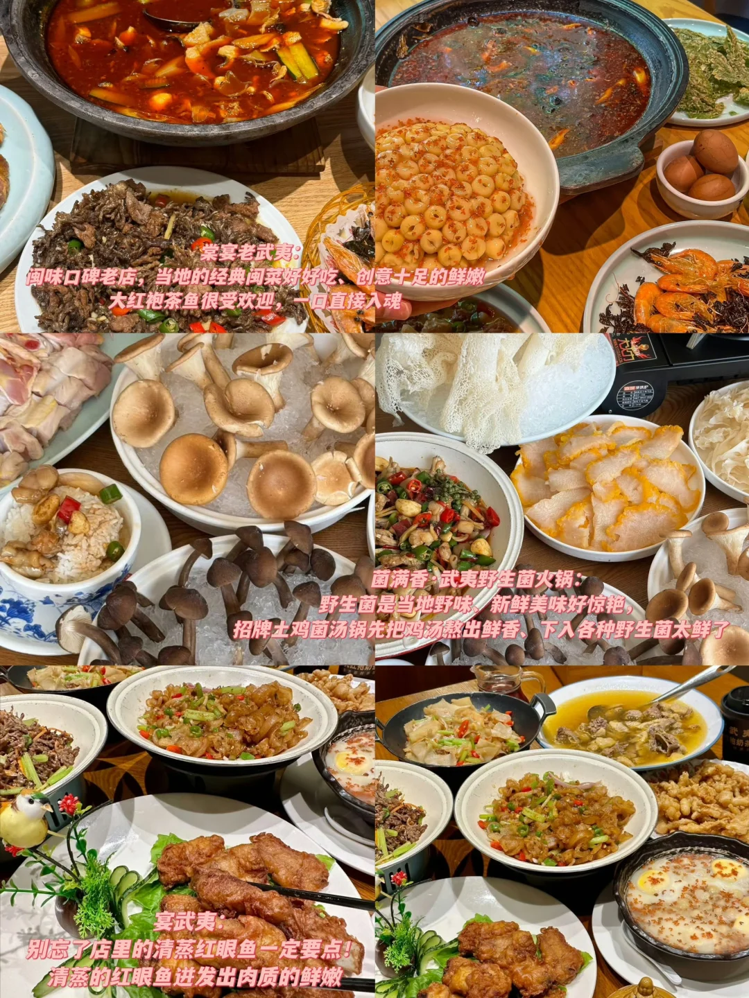 武夷山攻略抄作业版来了!!! 照着玩就对了!!! · ➡️武夷山游玩路线 1.自由打卡的景点:白云禅寺、遇林亭窑址、三姑度假村、印象建州、永乐禅寺、兰汤桥 2.室内打卡的景点:遇林亭窑址、武夷山博物馆、下梅古民居、武夷宫、止止庵、桃源洞 3.早上打卡的景点:大王峰、白云禅寺、虎啸岩、天游峰、九曲溪漂流、永乐禅寺 4.晚上打卡的景点:三姑度假村、印象建州、印象大红袍、兰汤桥 · ➡️住宿建议 🔸武夷山风景区周边:周边的山景很美、但交通不算是很便利、对住宿要求高的宝子可以考虑选在附近,享受度假的安逸乐趣 🔸三姑度假村:是热门住宿选择,热热闹闹的,距离景区不远,附近也有不少交通 🔸武夷山学院附近:住宿价格更实惠,感受当地的风土人情,美味小吃也很多 · ➡️武夷山美食 🍲棠宴老武夷:闽味口碑老店,当地的经典闽菜好好吃、创意十足的鲜嫩大红袍茶鱼很受欢迎,一口直接入魂,肉质鲜嫩好下饭啊,龙爪菇炒牛肉鲜爽可口,太满足了! 🍲菌满香·武夷野生菌火锅:野生菌是当地野味、新鲜美味好惊艳,招牌土鸡菌汤锅先把鸡汤熬出鲜香、下入各种野生菌太鲜了,养生鲜爽汤汁浓郁,鸡肉也很鲜嫩 🍲宴武夷:别忘了店里的清蒸红眼鱼一定要点!清蒸的红眼鱼迸发出肉质的鲜嫩、原汁原味的美妙风味好鲜甜、武夷熏鹅也是当地特色,越吃越上头 .
