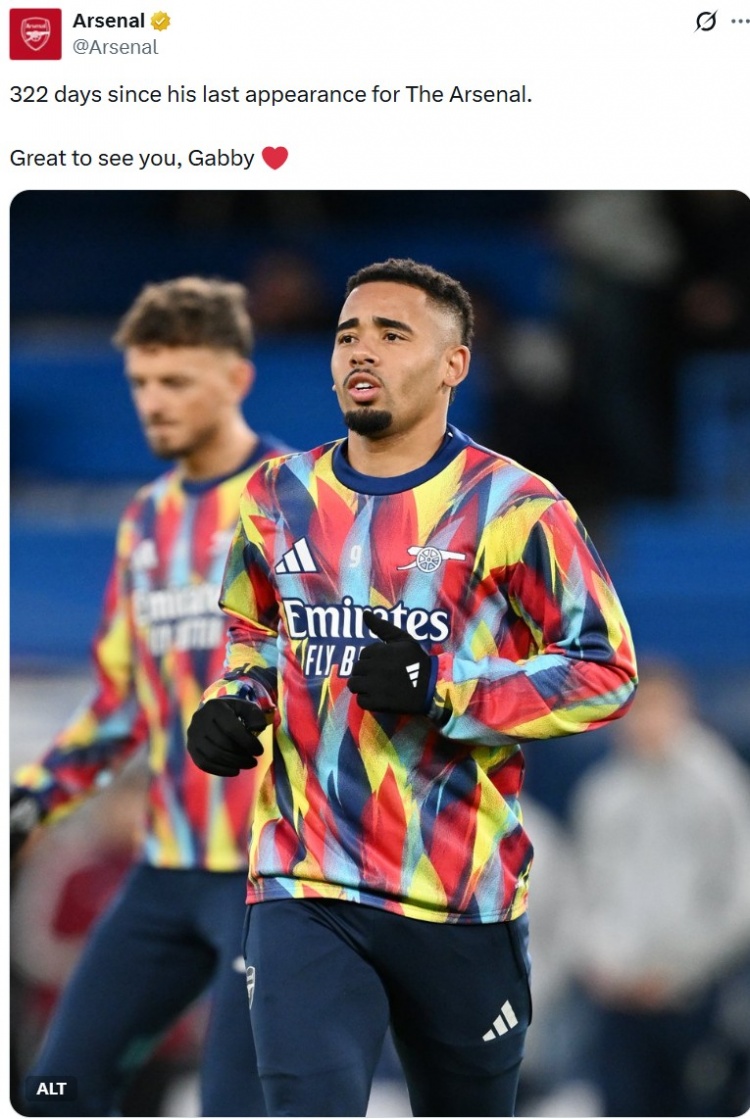 本场比赛热苏斯回归球队名单替补待命,阿森纳官推也晒出热苏斯赛前热身照片,配文写道:“上次为球队出场已经是322天前,很高兴看到你回归,热苏斯!”
