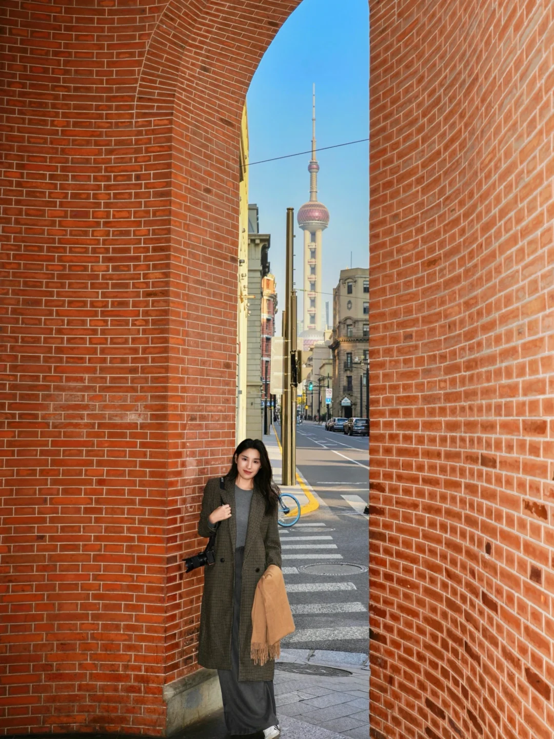 这里的拱形门投过去可以拍到东方明珠💎可以用拱形门为画框,也是超级绝的一个机位🤳