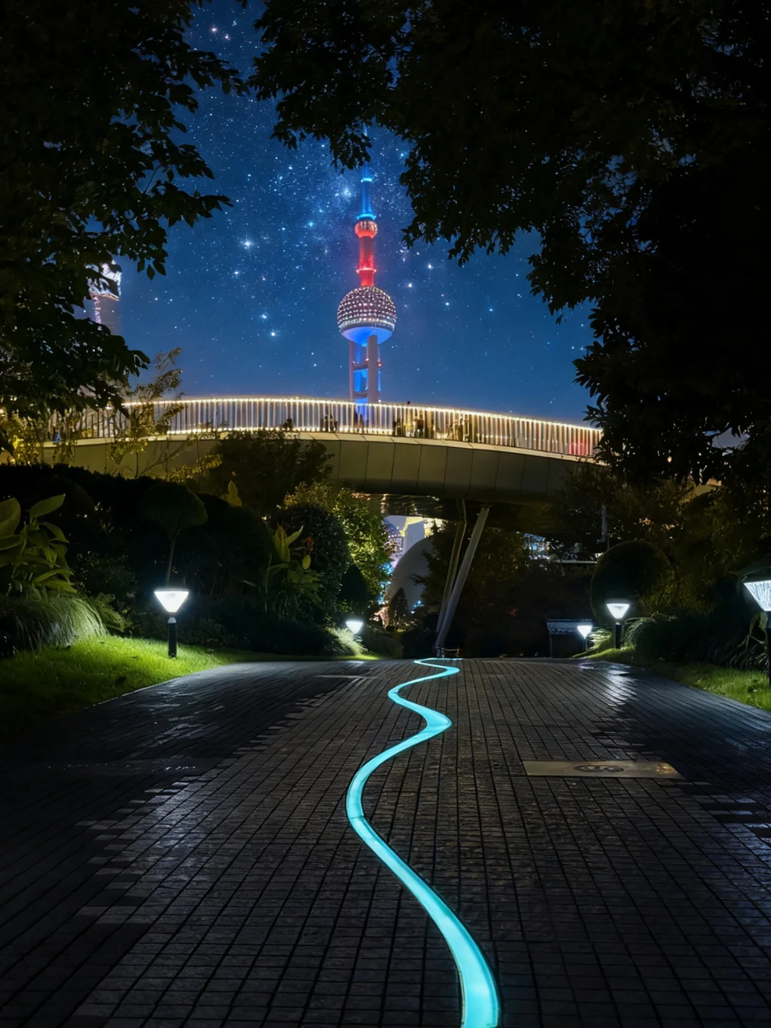 和小巨蛋就在一起,傍晚东方明珠亮起,地面的蓝色荧光路线,真的超美,光影科技感拉满