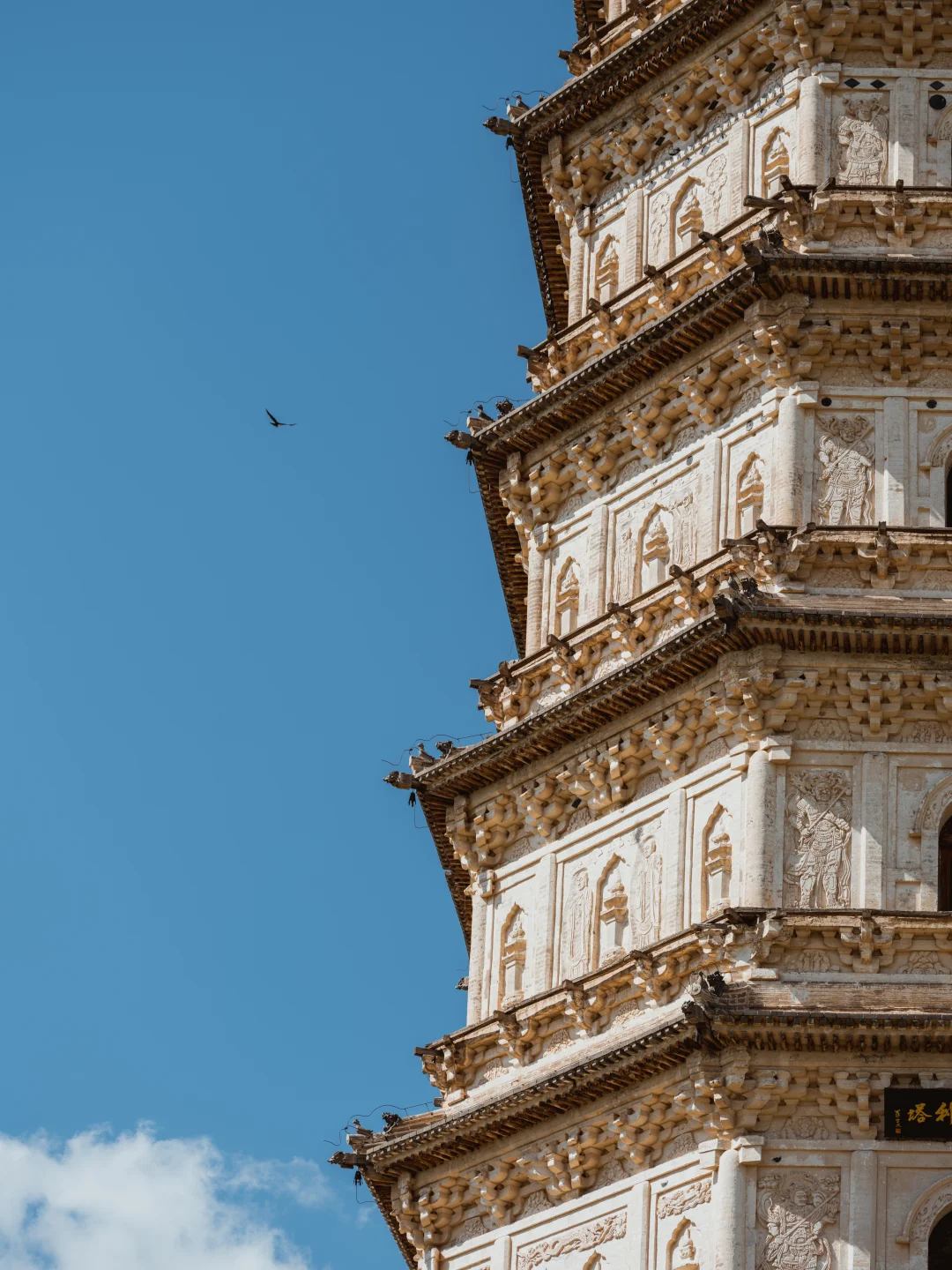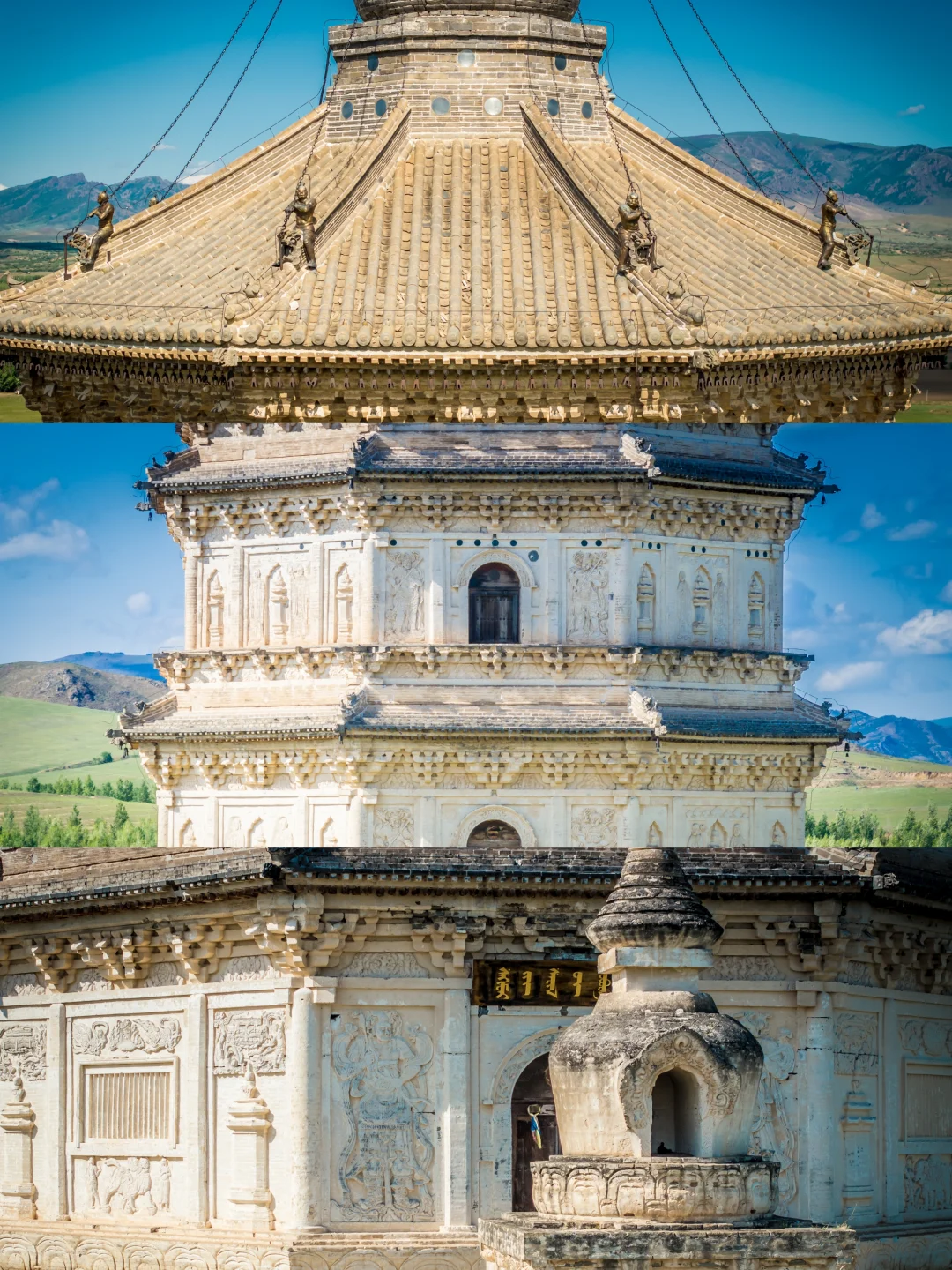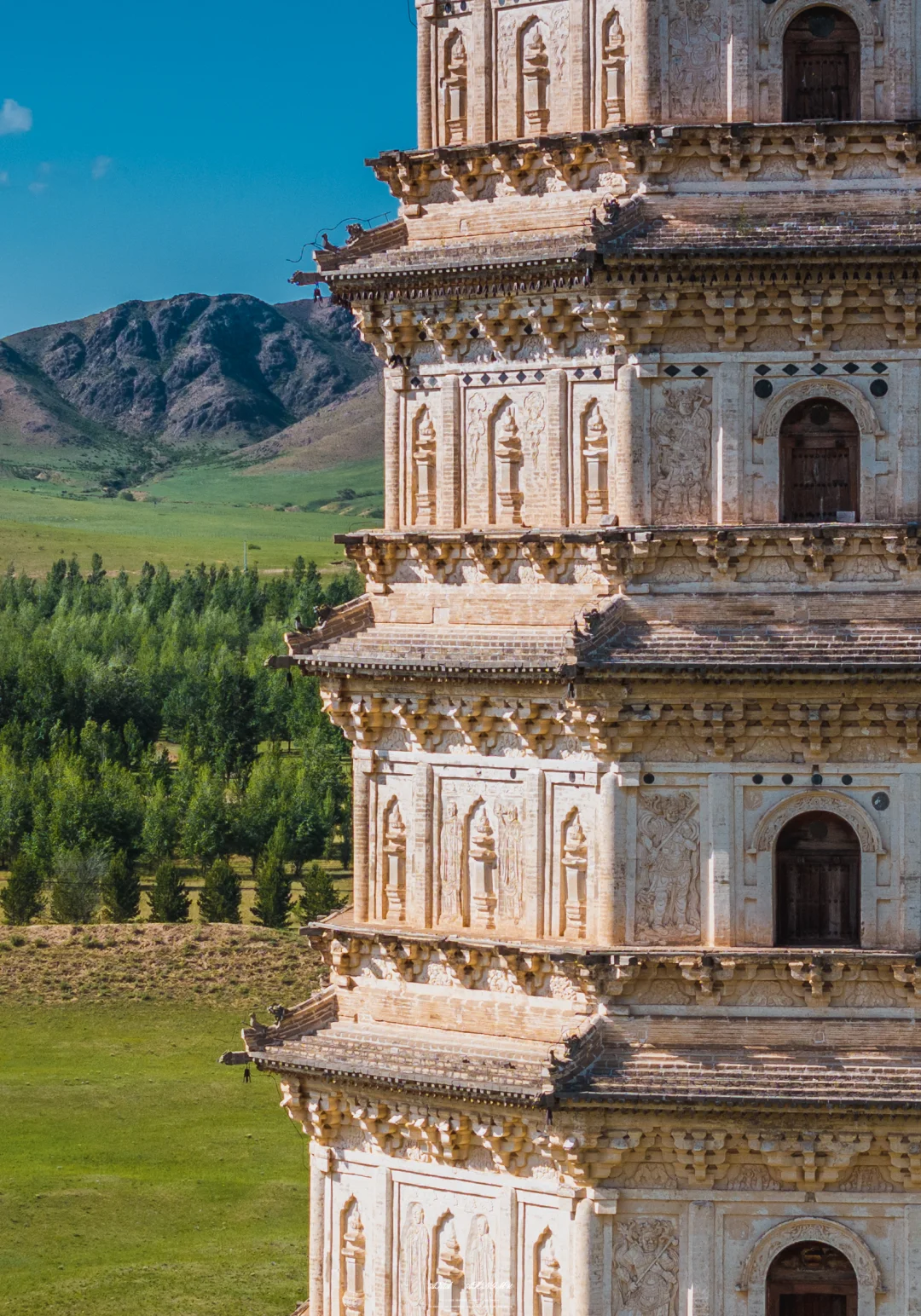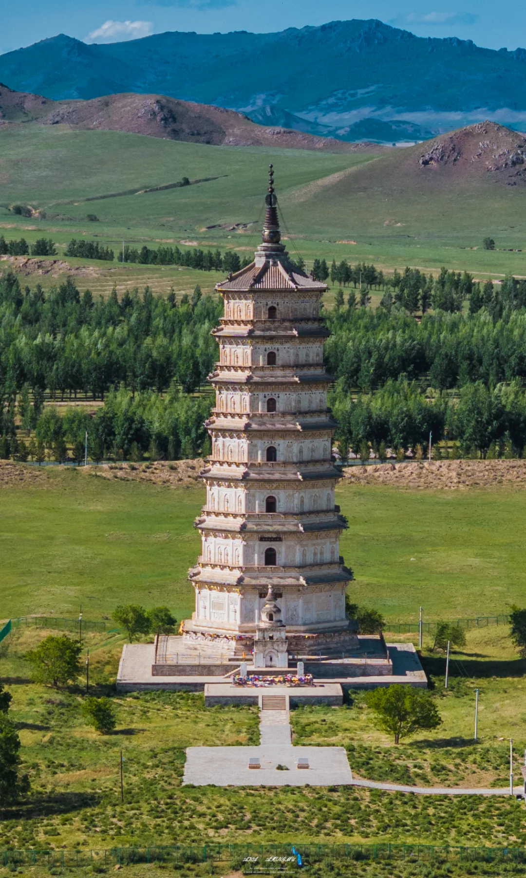 车窗外,内蒙古的草色初醒,仍裹着枯黄旧袄。 车子碾过巴林右旗的乡间小路,远方地平线上,忽有白影浮出草浪,如同沉船浮出水面——庆州白塔到了。 这塔身披素白,在旷野中兀自孤拔。风掠过草尖,爬上七级塔檐,惊动了檐角悬挂的铜铃,叮咚声被草原的辽阔托着,遥遥荡开,仿佛来自另一个时空的回响 🗿初见白塔,你很难相信这是座千年建筑。八角十三层的密檐式塔身,被风沙打磨得泛着温润的光,塔身八面的浮雕菩萨像,衣袂还保持着刚凿刻时的飘逸,只是鼻梁上落了层薄薄的黄沙,像哪位牧民随手抹上去的岁月印记。塔基四周的草甸里,零星长着些开蓝花的沙葱,风一吹,花穗蹭着塔身发出沙沙响,倒像是在跟老塔说些草原上的新故事。 ⏳当地人叫它“庆州白塔”,可翻起历史账本,它本名叫“释迦佛舍利塔”。辽圣宗为母亲章圣皇太后祈福建塔时,大概没想到一千年后,草原会吞噬掉庆州城的残垣,当年,金人的铁蹄无情地踏碎了庆州城的宫墙,城内的宫殿、房屋在战火中化为废墟,然而当他们来到白塔前,在那莲花座下,却不由自主地迟疑了。即使是被视为野蛮的民族,面对这座精美绝伦的白塔,内心也会被它的魅力所震撼,不忍心将其毁掉,这座塔像枚定海神针,成为了整个庆州唯一的遗留物。1989年修缮时从塔刹天宫出土的那件银鎏金舍利瓶,现在躺在博物馆里闪着光,我仰头细看,塔身层层叠叠的浮雕:菩萨垂目低眉,金刚怒目圆睁,蟠龙在砖石间游动……千年风沙磨蚀了棱角,却让那些辽代匠人的虔诚与威严,在残缺处渗得更深 💫离开时回头望,白塔已经融在暮色里,只剩轮廓线和天上的月牙儿相映。忽然想起博物馆里那卷从塔中出土的辽代写经,墨色在宣纸上洇开的纹路,竟和塔身上的砖缝走向莫名相似。原来有些时光啊,早就把自己刻进了石头里,等着风来读,等着人来懂。这草原深处的白塔,哪是什么建筑,分明是一千年的光阴凝成的守望者,守着沙砾里的往事,也守着每双望向它的眼睛