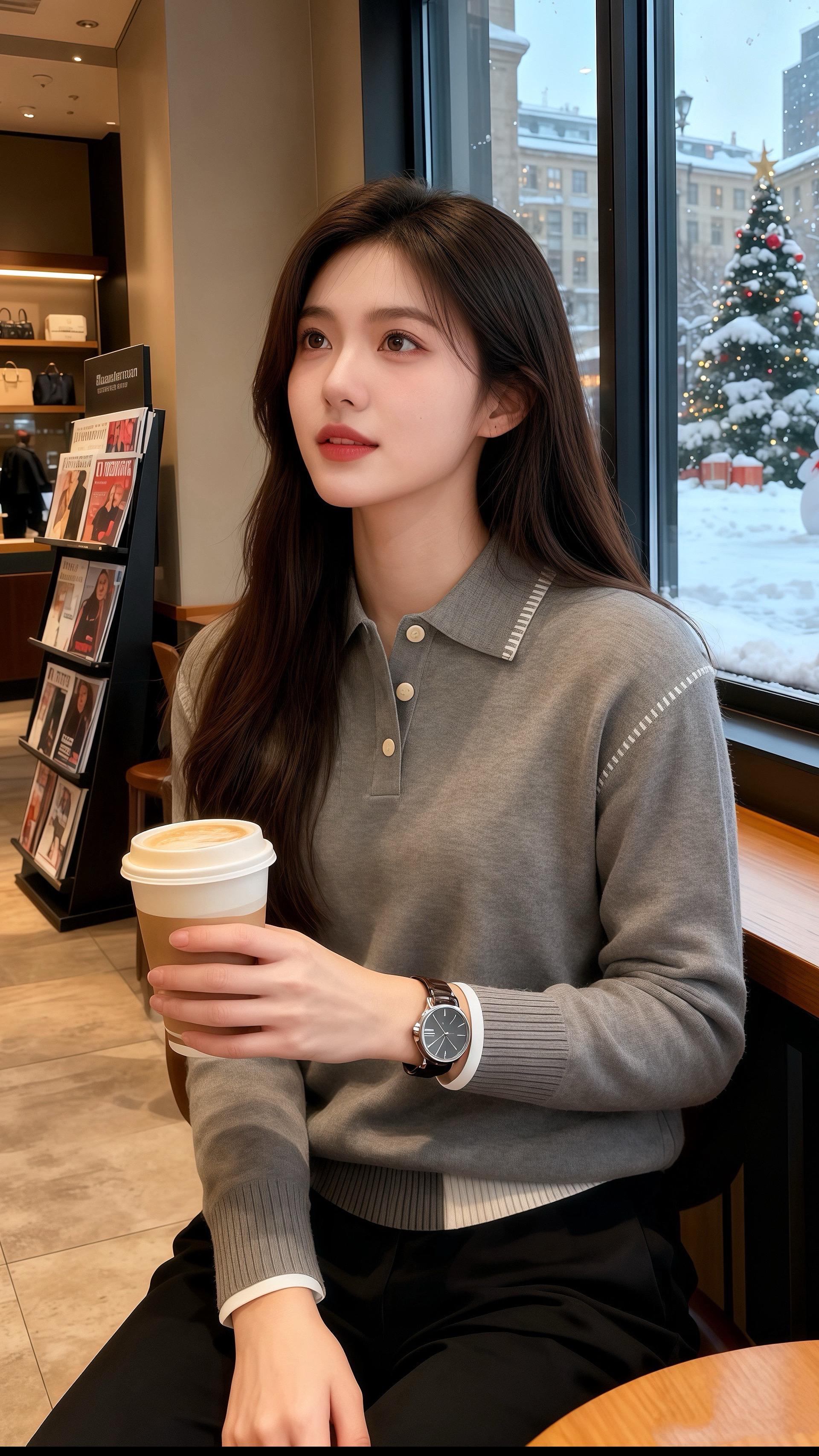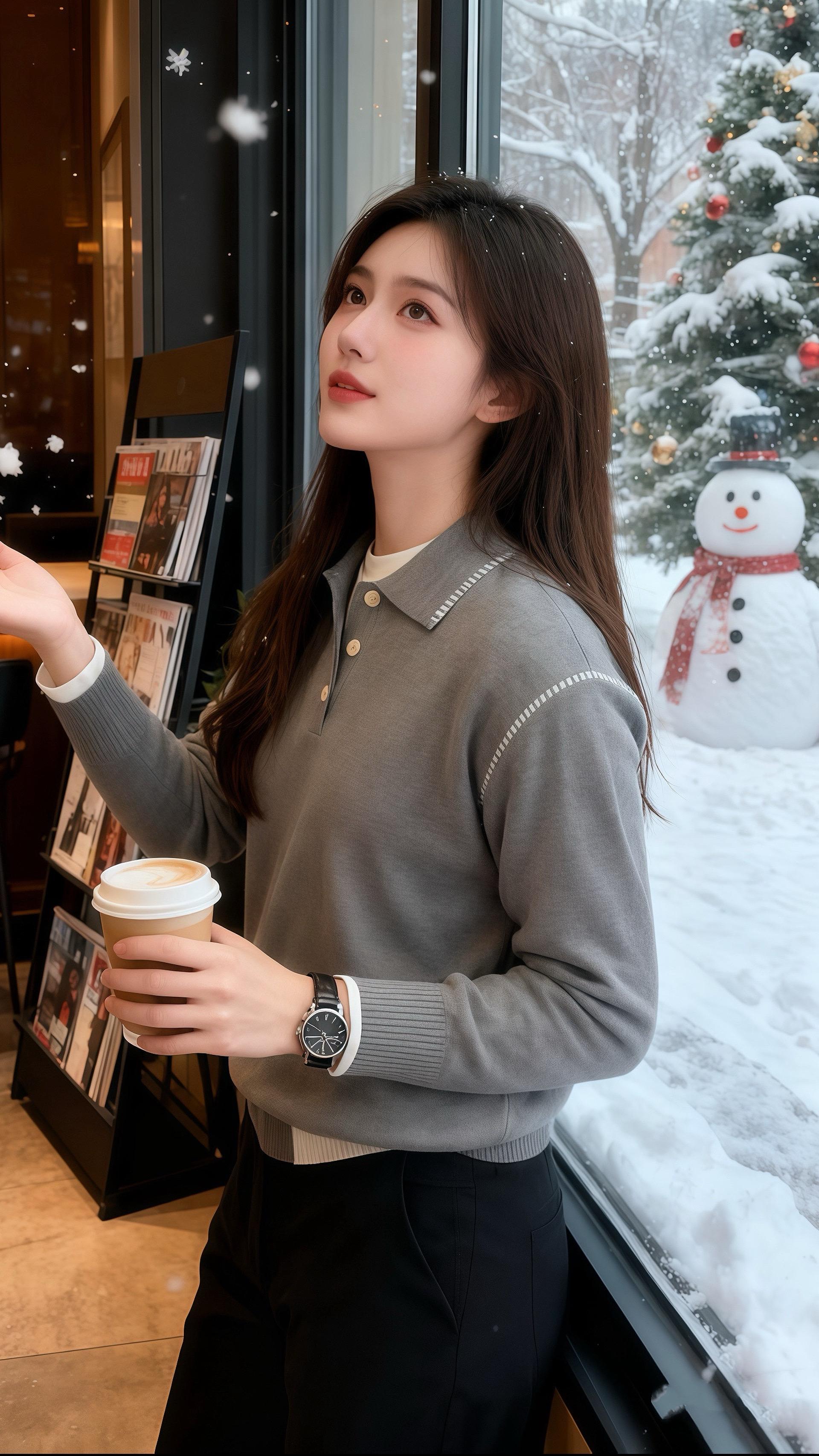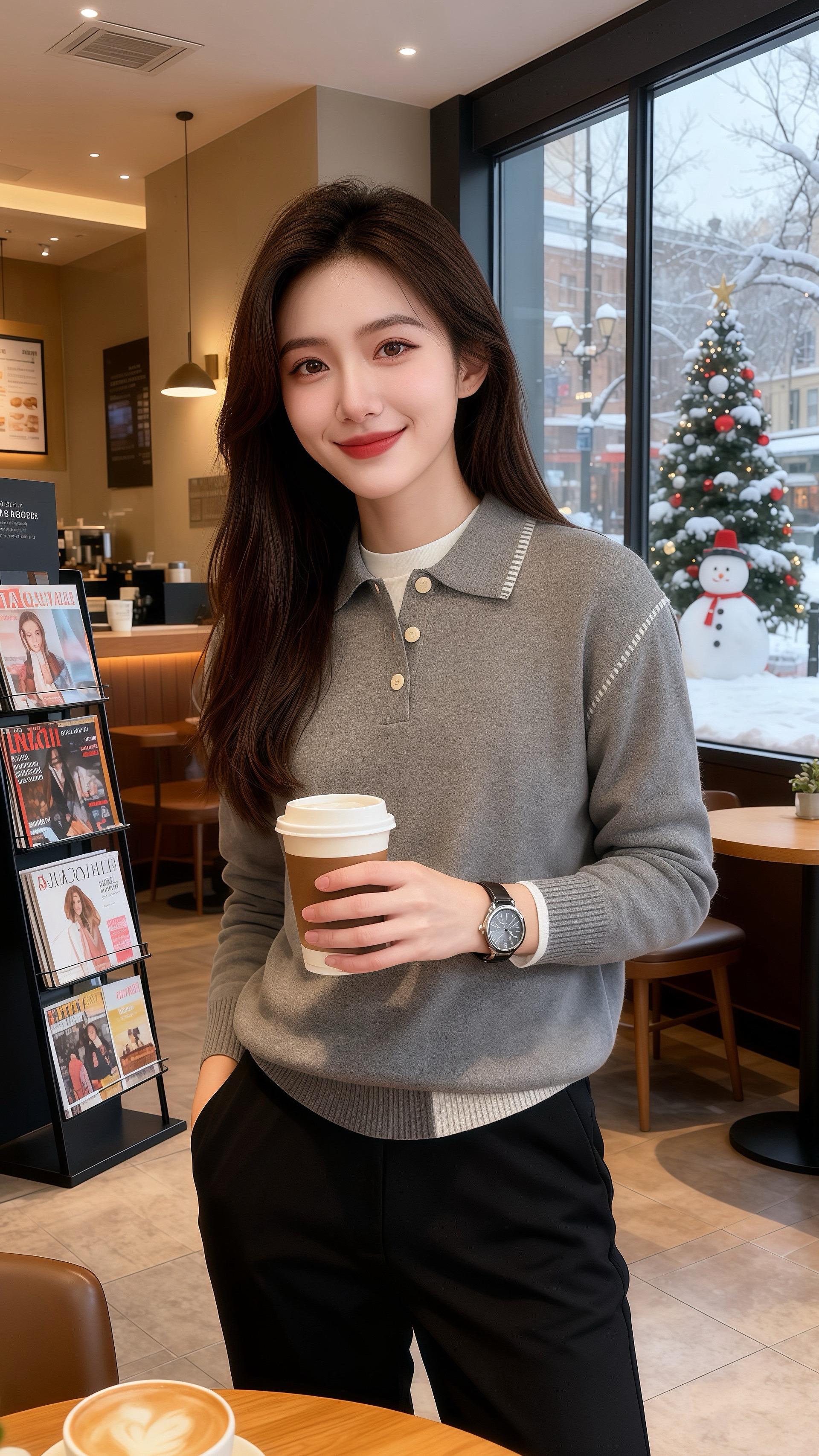 雪粒子敲在咖啡馆玻璃上时,苏也正抬着杯热拿铁看窗外的圣诞树。她穿的灰调针织衫很衬冬日,领口那排细密的针脚像落了层软雪,内搭的白边从领角露出来,和黑裤装揉出恰好的柔和。左手腕的表带着点冷感金属纹,却被她握杯子的指尖焐得温软。