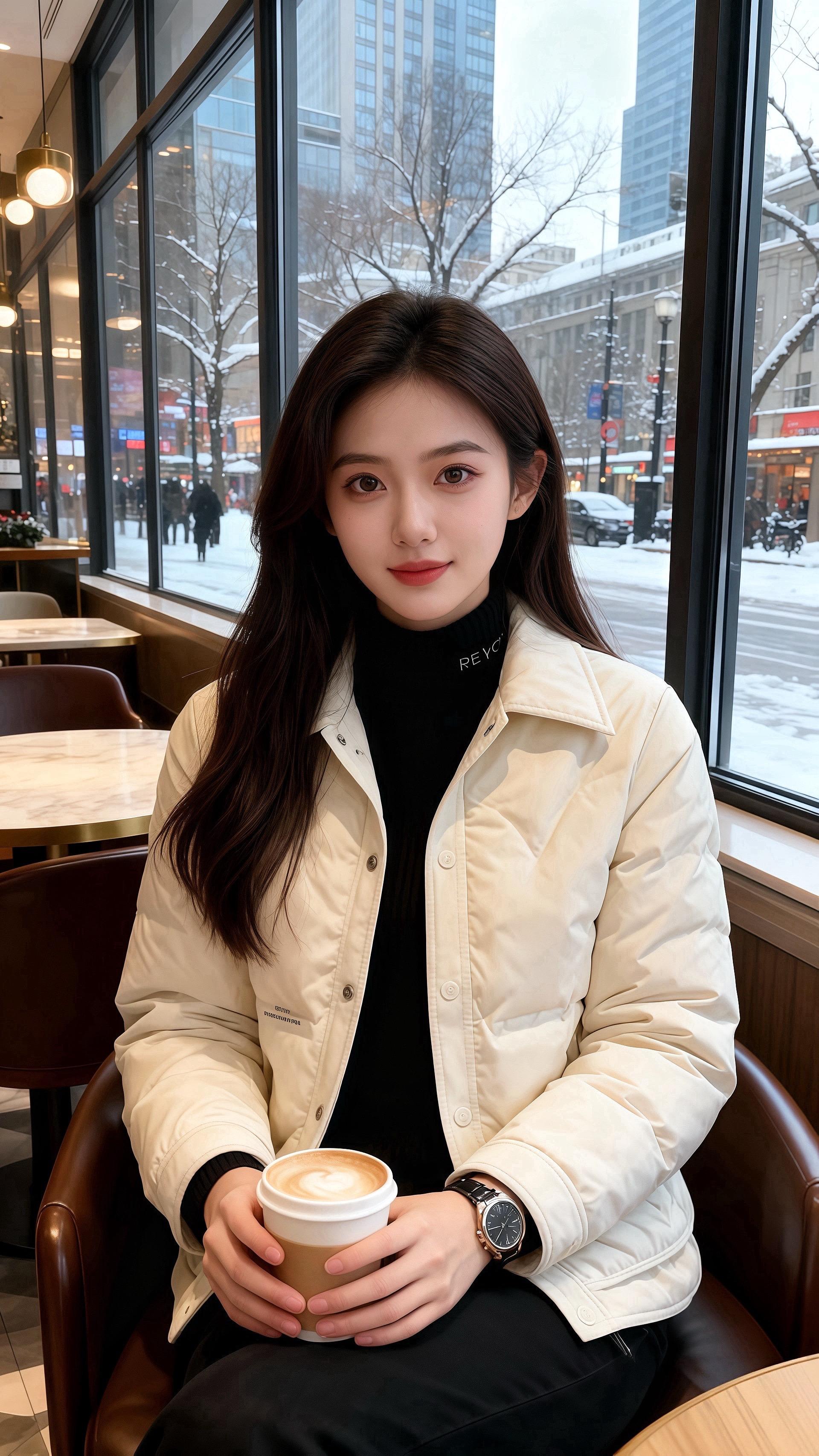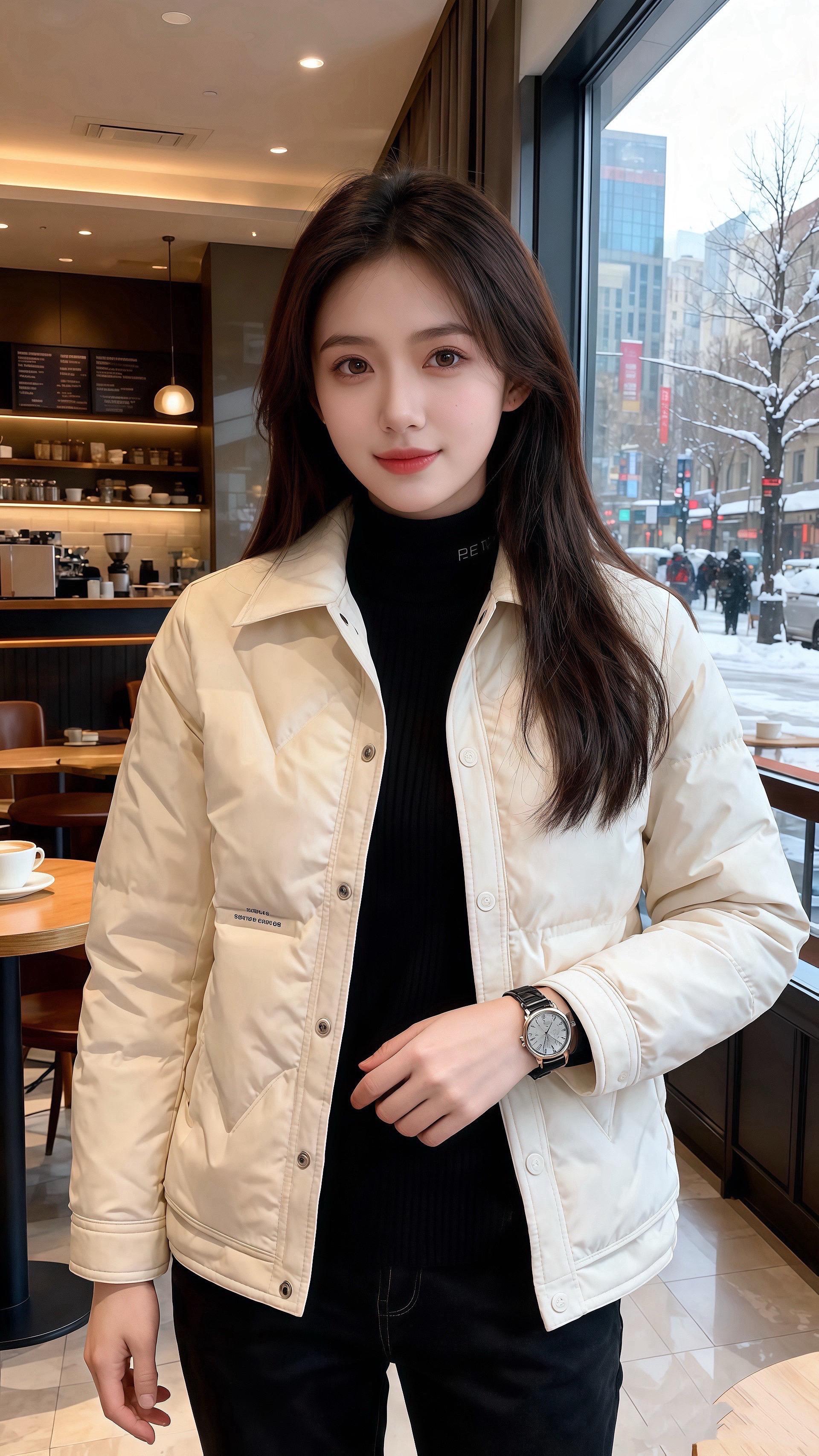 落雪沾在橱窗玻璃上时,许妍正抱杯热拿铁坐在咖啡馆里。她身上的米白棉服衬得冬意都软和——面料看着轻暖,翻领刚好露出细颈,菱格绗缝不显臃肿,配着黑内搭,松弛里裹着温温的质感。