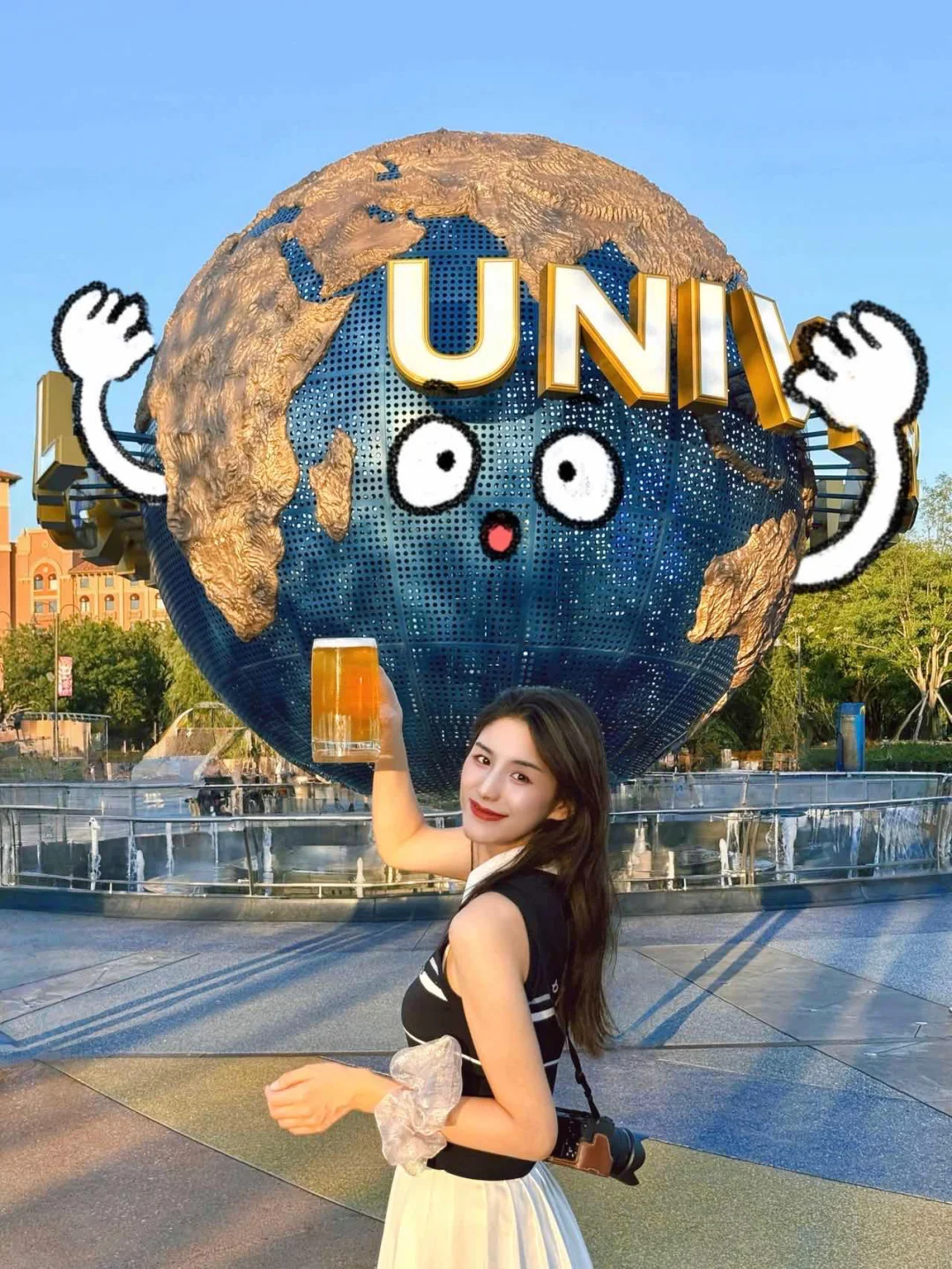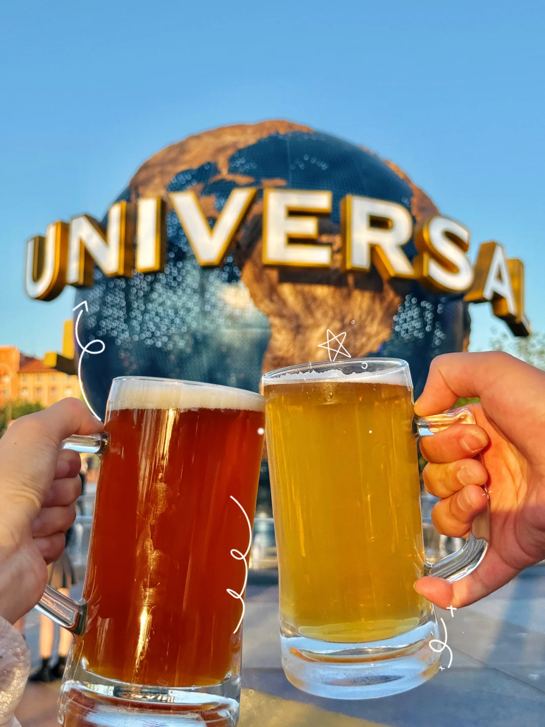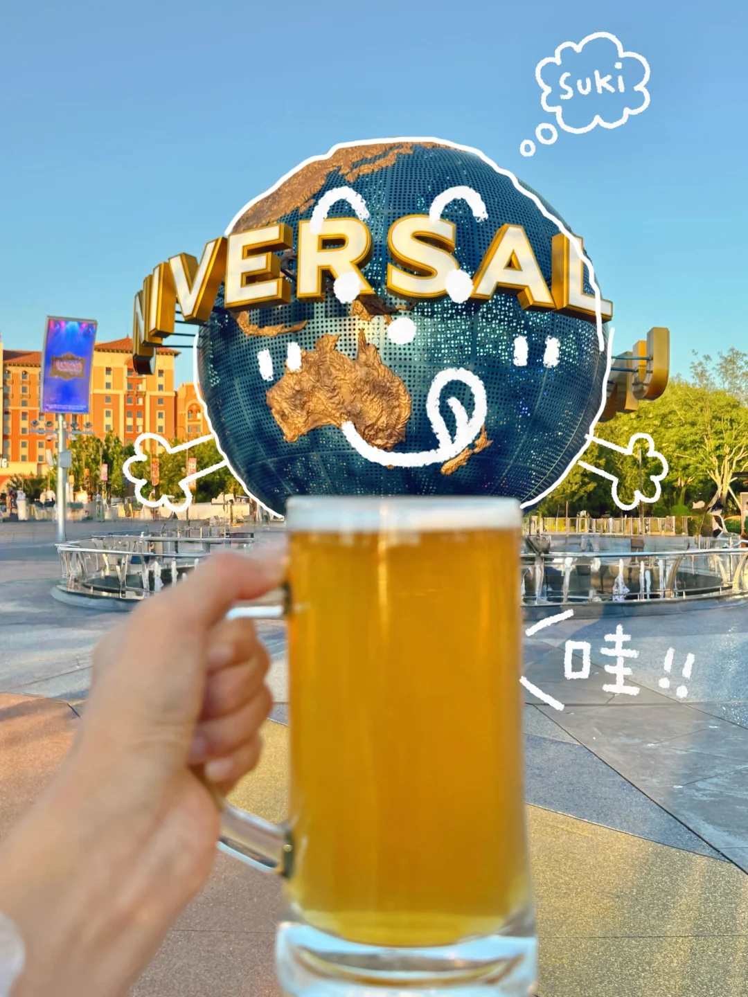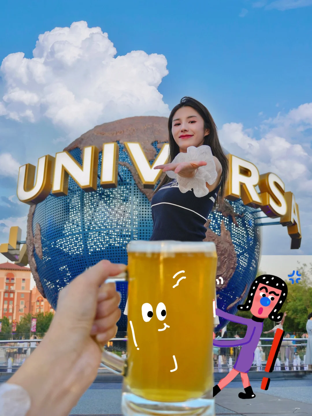 🔆环球大球前:人物双手拿着啤酒向前举杯,0.5x拍摄,就可以拍出酒杯很大和人物的反差萌感