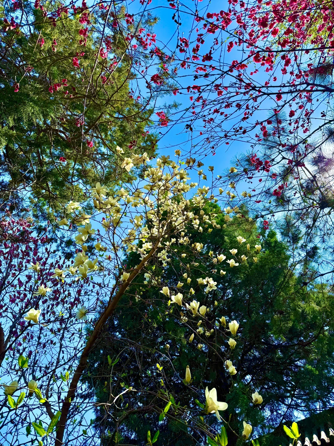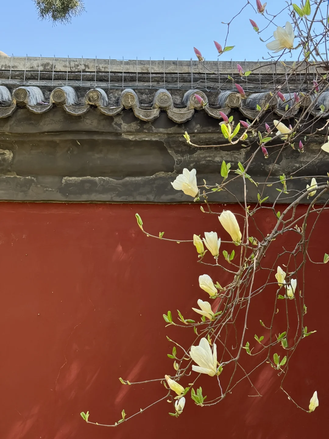 有一棵双色玉兰花,一侧是粉色,一侧是白色搭配红墙太美了,这块周边有绿化带,只能在外外面拍