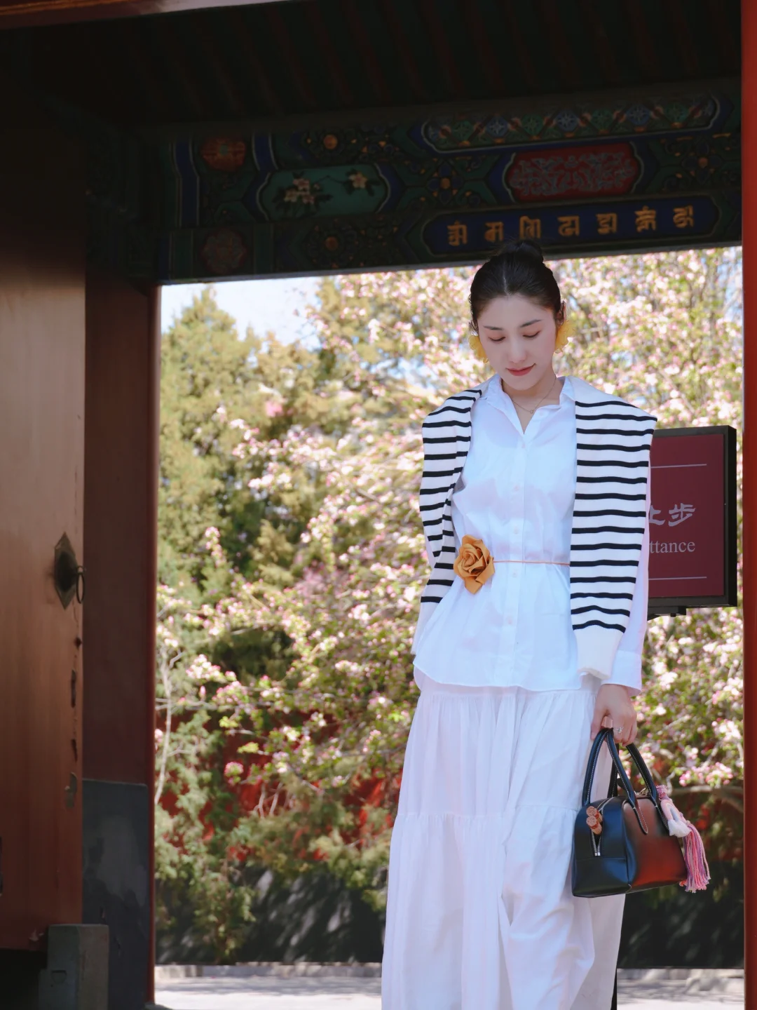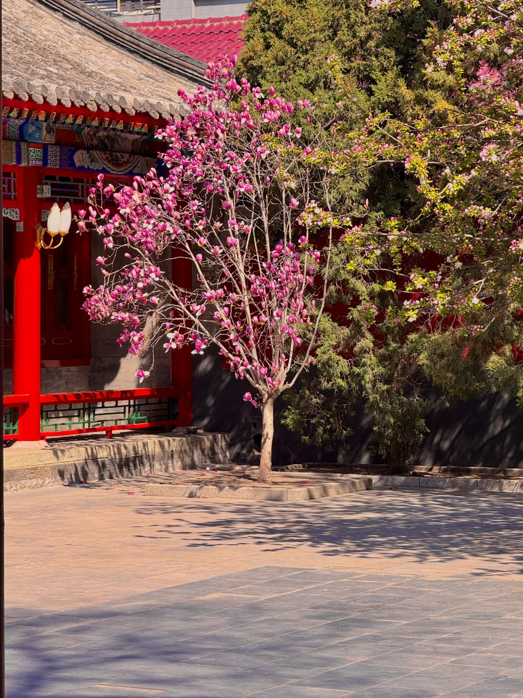 院内有一颗超大海棠花,目前开放60%,旁边还有棵红色玉兰花,这块可在门口拍📷