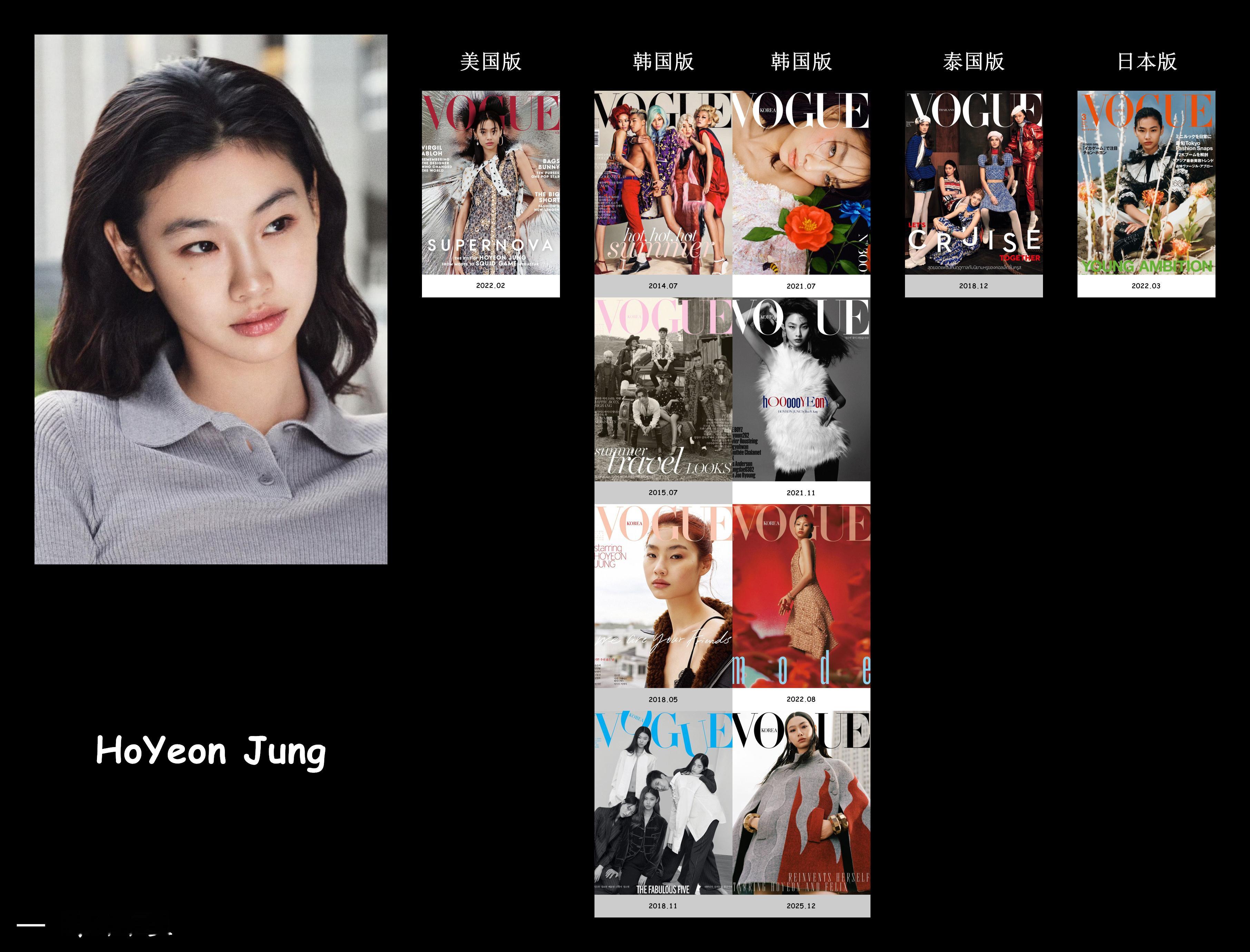 郑浩妍 Hoyeon Jung × VOGUE 封面集 4️⃣ 个版本共计 1️⃣1️⃣ 刊 头部封面履历很好看 ,但只看 VOGUE 版图反而差点意思 ,不算输出的 VOGUE Japan 以外其实《鱿鱼游戏》爆红以来姐正儿八经只拍了三张 VK 和一张 VUS ,当然了 ,能 OG 四大自然了不起 ,但入门的澳版甚至其他二线都没能顺势进行扩张属实有些意外 ,不过今年整体成绩还是不错的 ,VK 收官以外年初拿到了母版 W Magazine 以及下半年还有一张 ELLE UK ,高曝光的 LV 秋冬成衣 + 首支美妆广告也十分给力 、各路刷脸 ,这亦是时隔两年多时间再度进账 VOGUE 封面 .