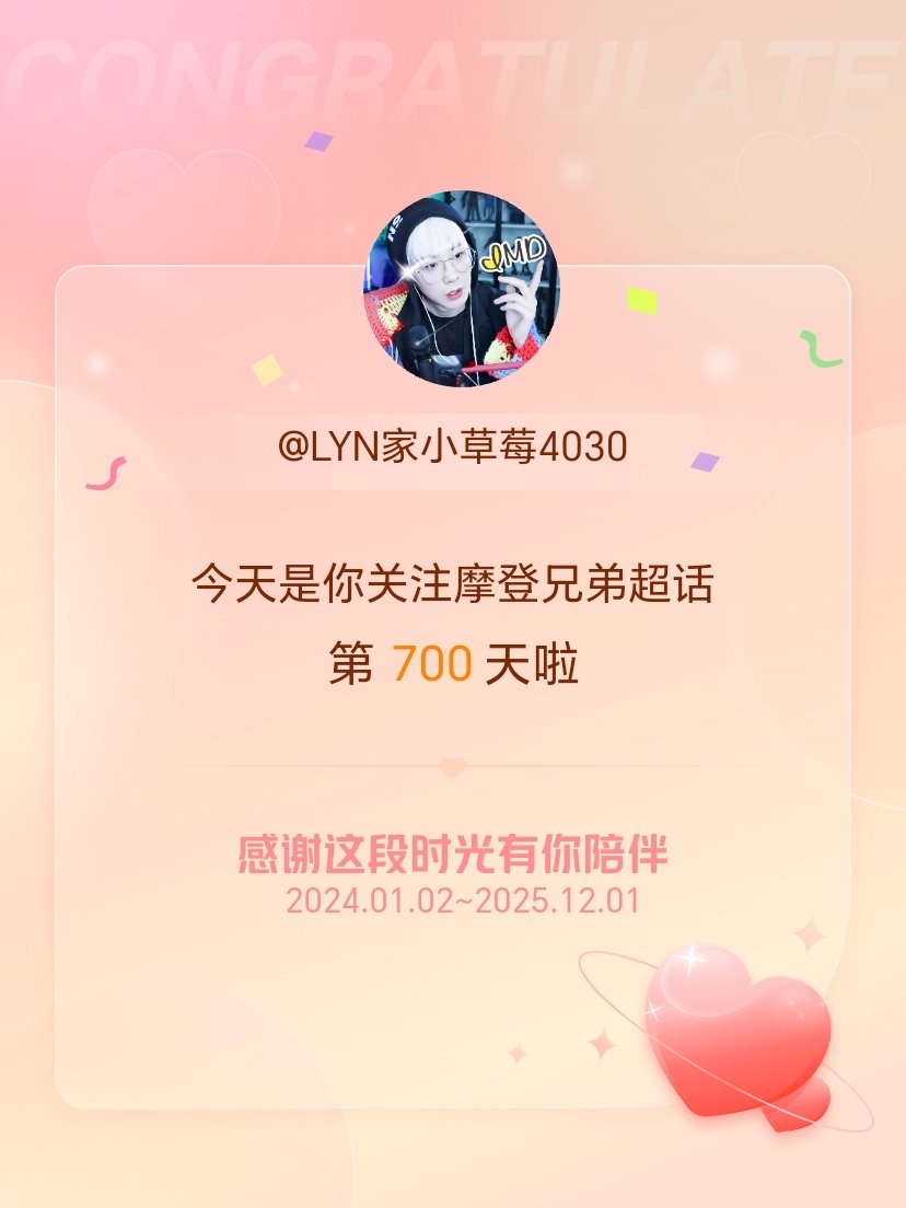 居然已经700天了!果然,陪伴是最长情的告白!以后也一直在一直爱呀!今天是我关注超话的第700天,希望能继续伴你一路前行~