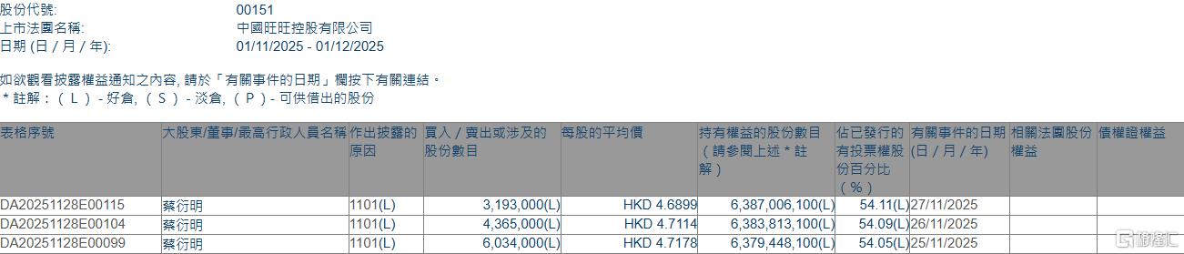 格隆汇12月1日丨根据联交所最新权益披露资料显示,2025年11月25日-11月27日,中国旺旺(00151.HK)获执行董事蔡衍明在场内以每股均价4.6899-4.7178港元合计增持1359.2万股,涉资约6401万港元。