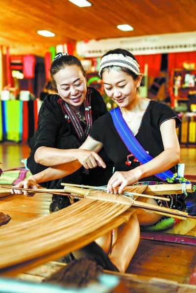 李宪兰(左)指导学员学习佤族织锦技艺。受访者供图