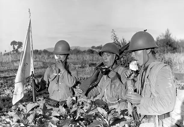 三个日本鬼子,在老百姓的菜地里偷吃茄子,在他们的身上用“偷”都是奢侈的,应该用肆无忌惮的吃老百姓地里的茄子,丑恶的侵略者嘴脸暴露无遗。