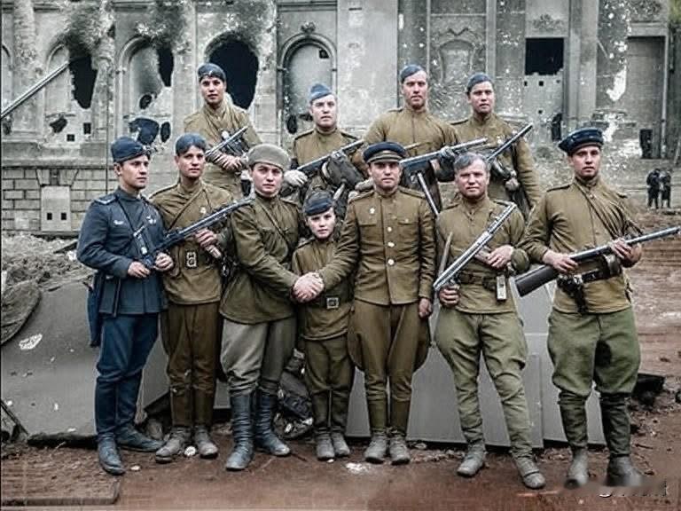 1945年5月初,柏林战役后,一群苏军战士在国会大厦(Reichstag)废墟前合影。 这张照片是战地摄影师叶夫根尼·哈尔代伊(Yevgeny Khaldei)在第二次世界大战欧洲战场结束前拍摄的一系列照片之一,他当时携带了一面由叔叔用三块红色桌布缝制的苏联国旗。哈尔代伊拍摄了多张照片,记录了苏军士兵在柏林各地,包括国会大厦,展示胜利旗帜的情景。 照片中的士兵隶属于第150步兵师第756步兵团的侦察队。画面中央的小男孩是该团的养子格奥尔基·阿尔捷缅科夫(Georgy Artemenkov)。 柏林战役是二战欧洲战场的最后一场重大战役,此照片象征着苏联战胜纳粹德国。