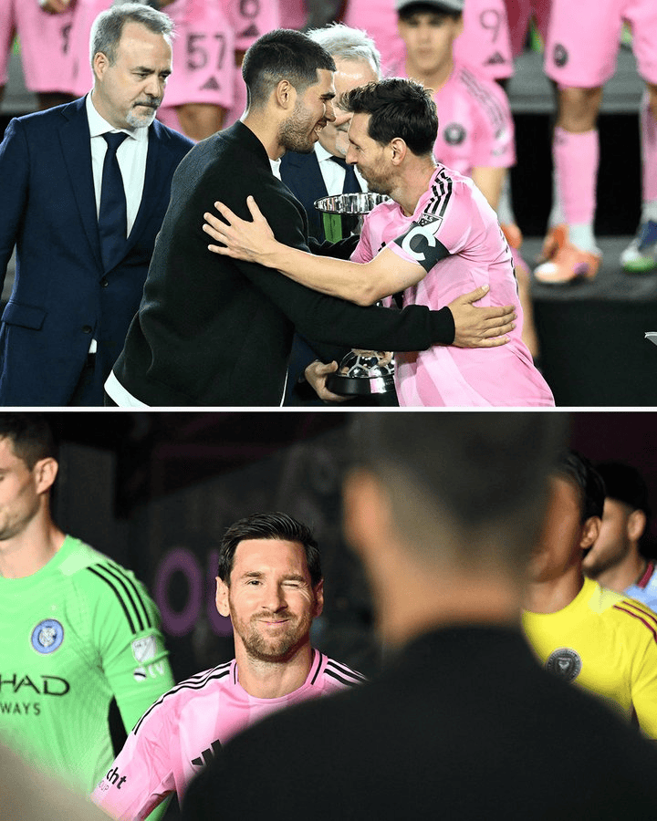 赛后,网球选手阿尔卡拉斯为迈阿密国际颁奖,并与迈阿密国际的球员梅西拥抱。