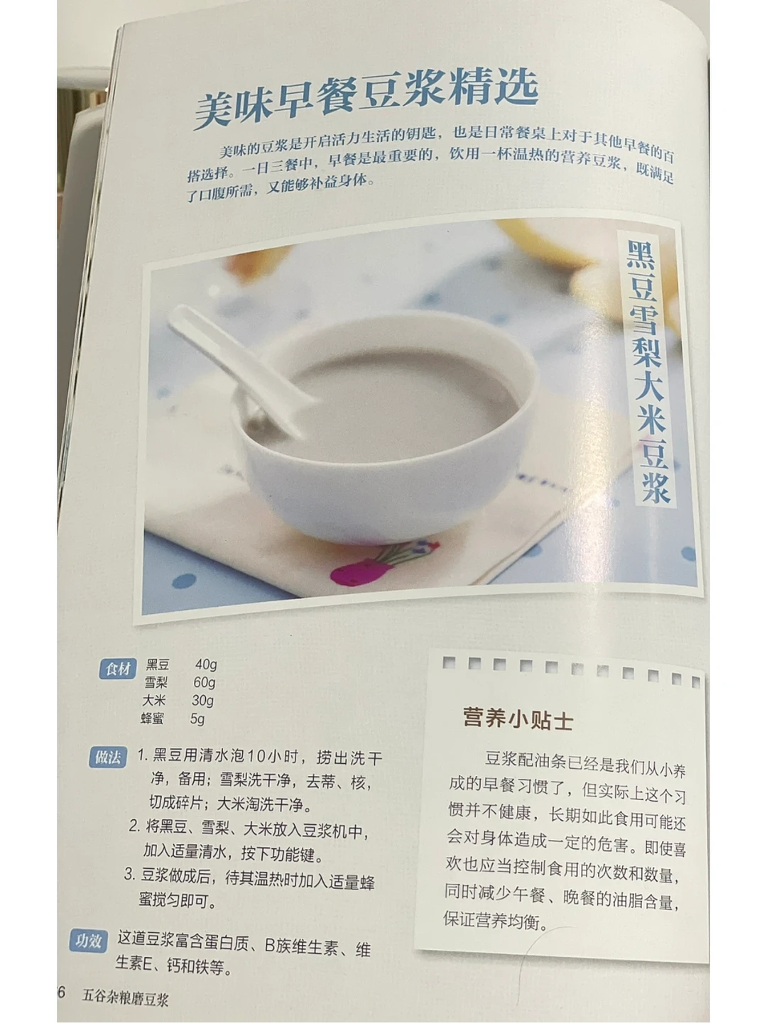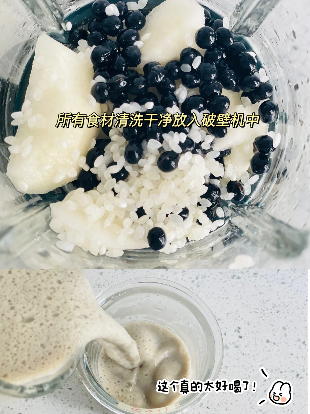 ✅美味的豆浆是开启活力生活的钥匙,也是日常餐桌上对于其他早餐的百搭选择,一日三餐中,早餐是最重要的,来一杯暖暖的营养豆浆,既满足了口腹所需,又能够补益身体。 ✅黑豆雪梨大米豆浆:全家老少都可以喝的,真的非常好喝,大家可以试试,我的配比是2个人的量[害羞R] ✅所有食材清洗干净放入破壁机中,加至清水至600ml水位线,豆浆模式即可。 ✅养生功效:这道豆浆富含蛋白质,B族维生素,维生素E、钙和铁等。 益气补肾、健脾养胃、润燥化痰、通便润肤[派对R]