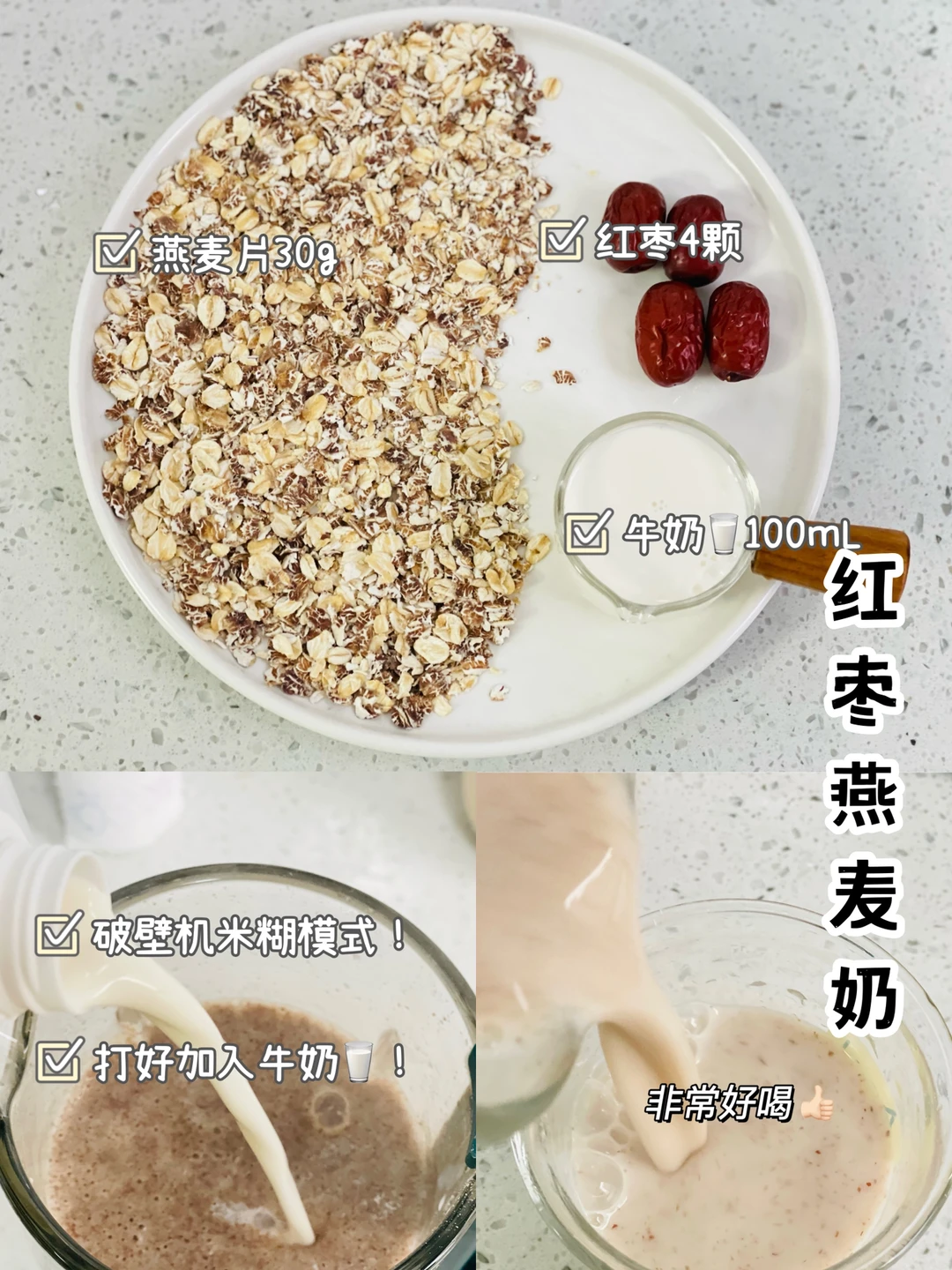 将燕麦片红枣放入破壁机中,➕清水至500mL水位线,米糊模式,打好放入100mL牛奶搅拌即可!
