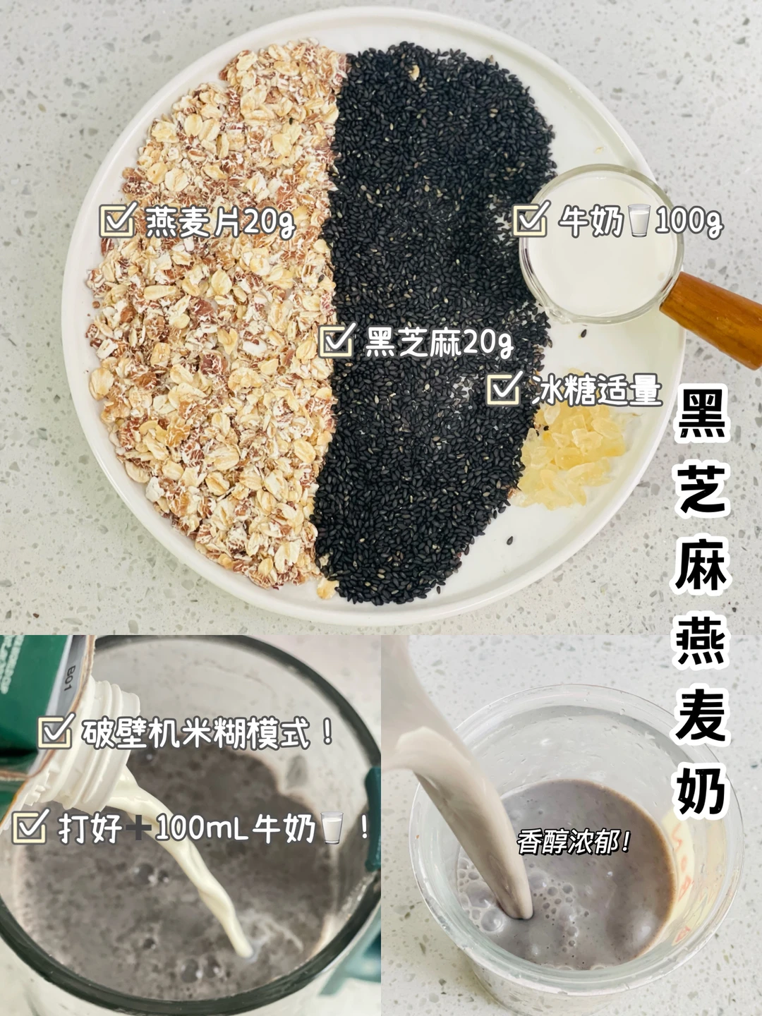 将燕麦片芝麻冰糖放入破壁机中,➕清水至500mL水位线,米糊模式,打好放入100mL牛奶搅拌即可!