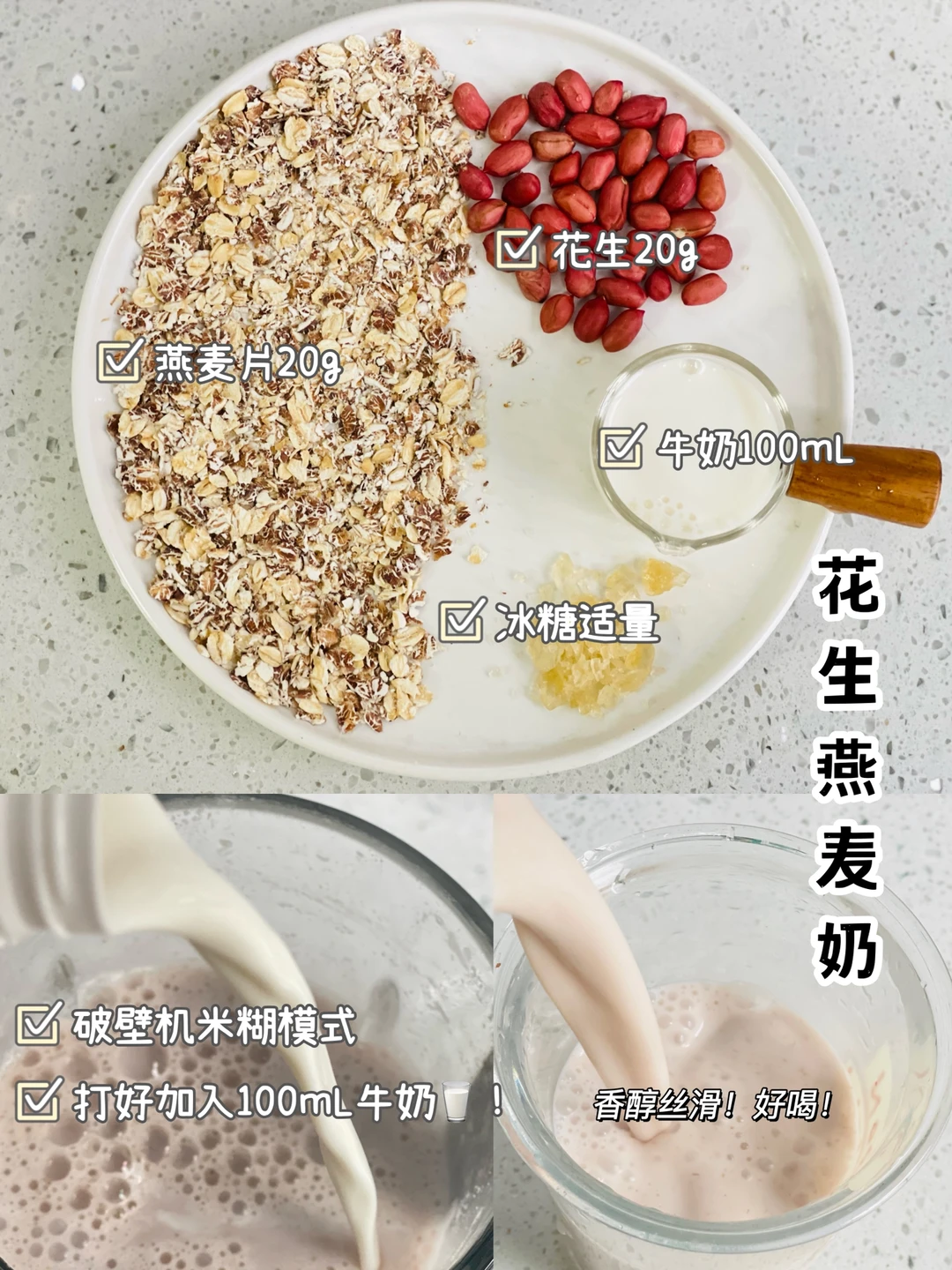 将燕麦片花生冰糖放入破壁机中,➕清水至500mL水位线,米糊模式,打好放入100mL牛奶搅拌即可!