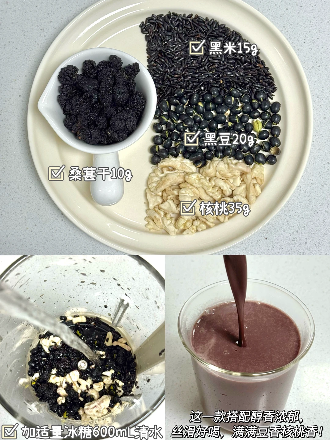 4️⃣桑葚干10g➕黑米15g➕黑豆20g➕核桃35g➕600mL清水➕适量冰糖(桑葚核桃豆浆,2人量)