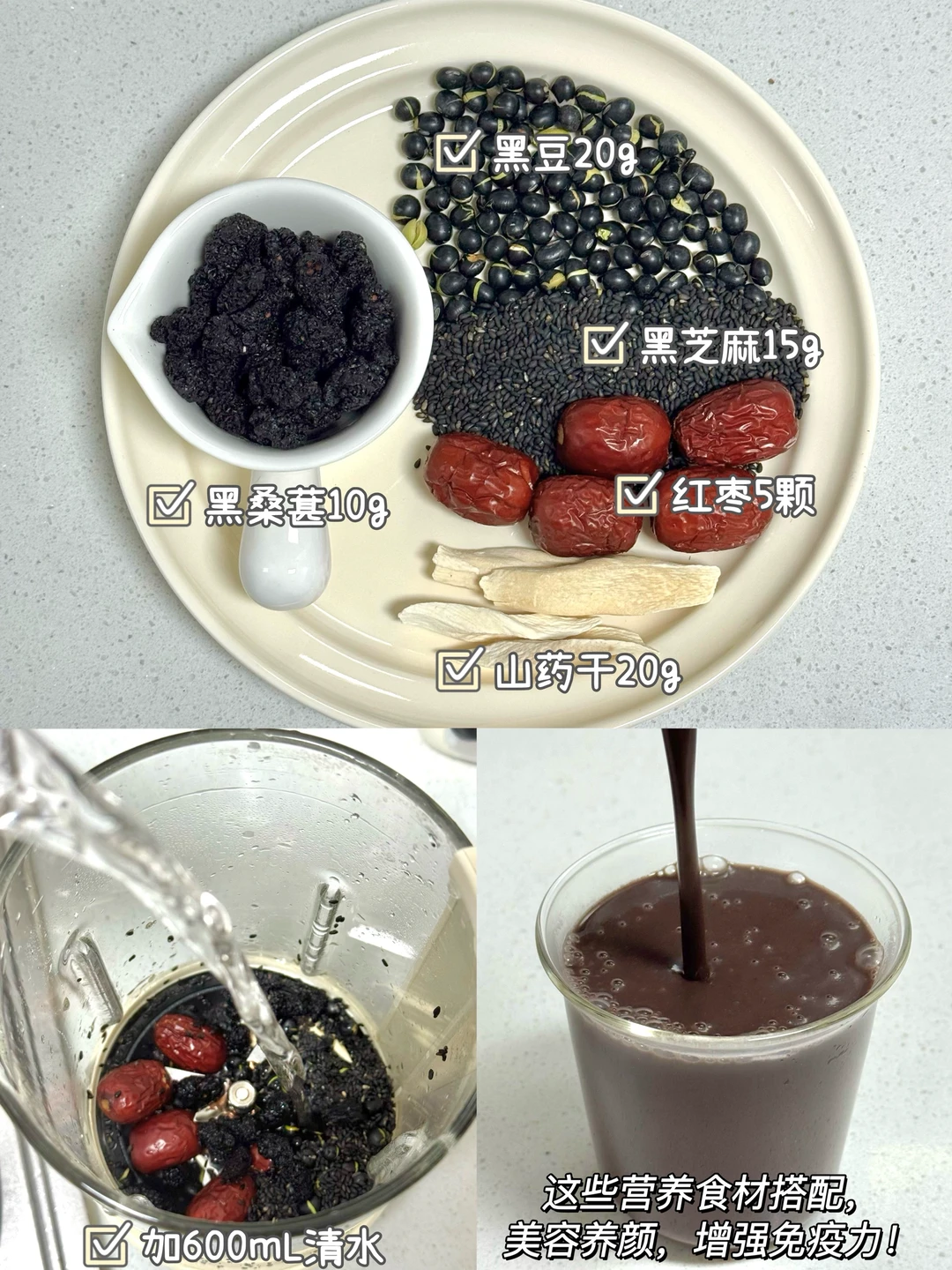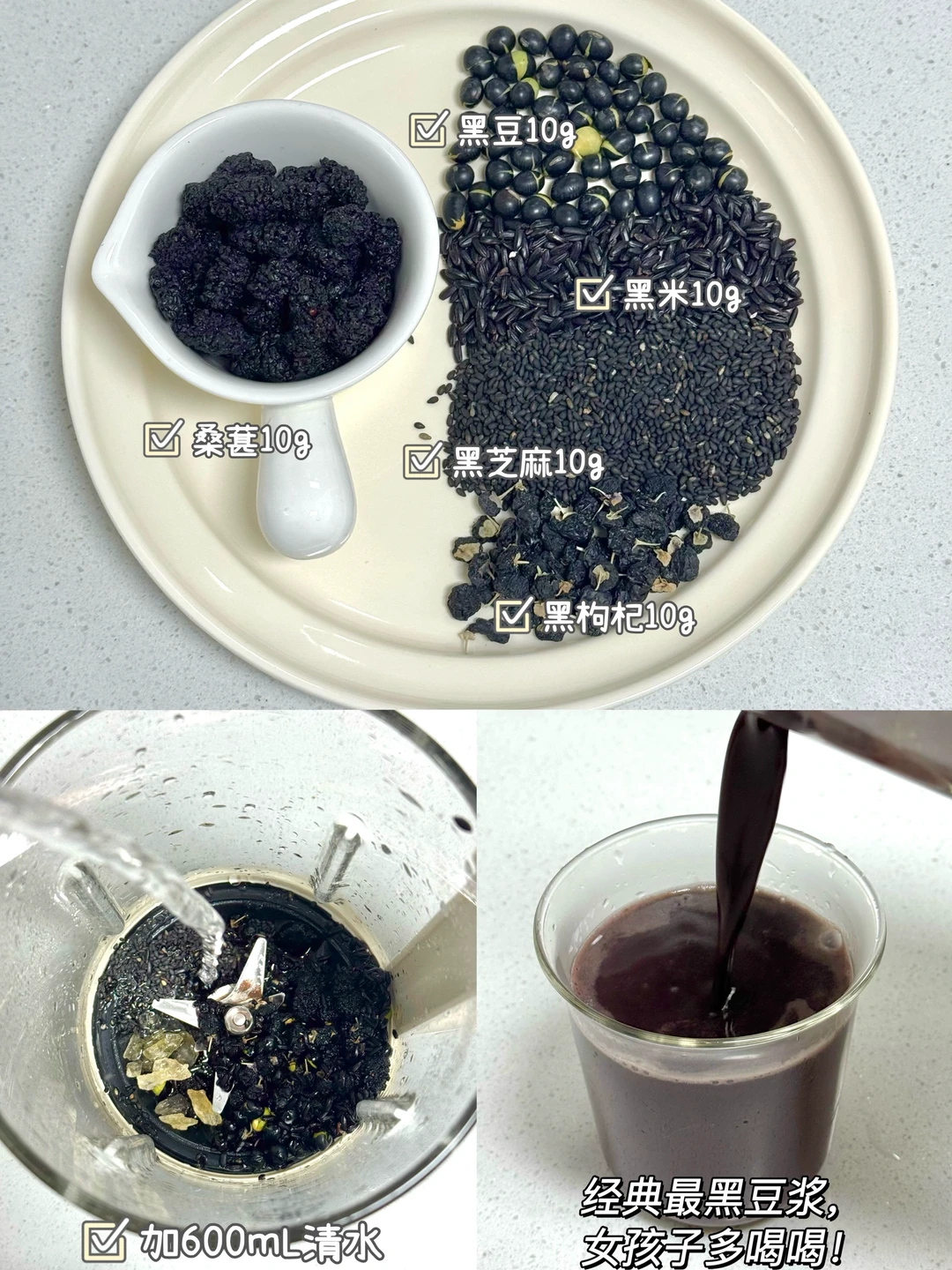 1️⃣桑葚干10g➕黑豆20g➕黑芝麻15g➕红枣6颗➕山药干30g➕600mL清水(桑葚山药豆浆,2人量)
