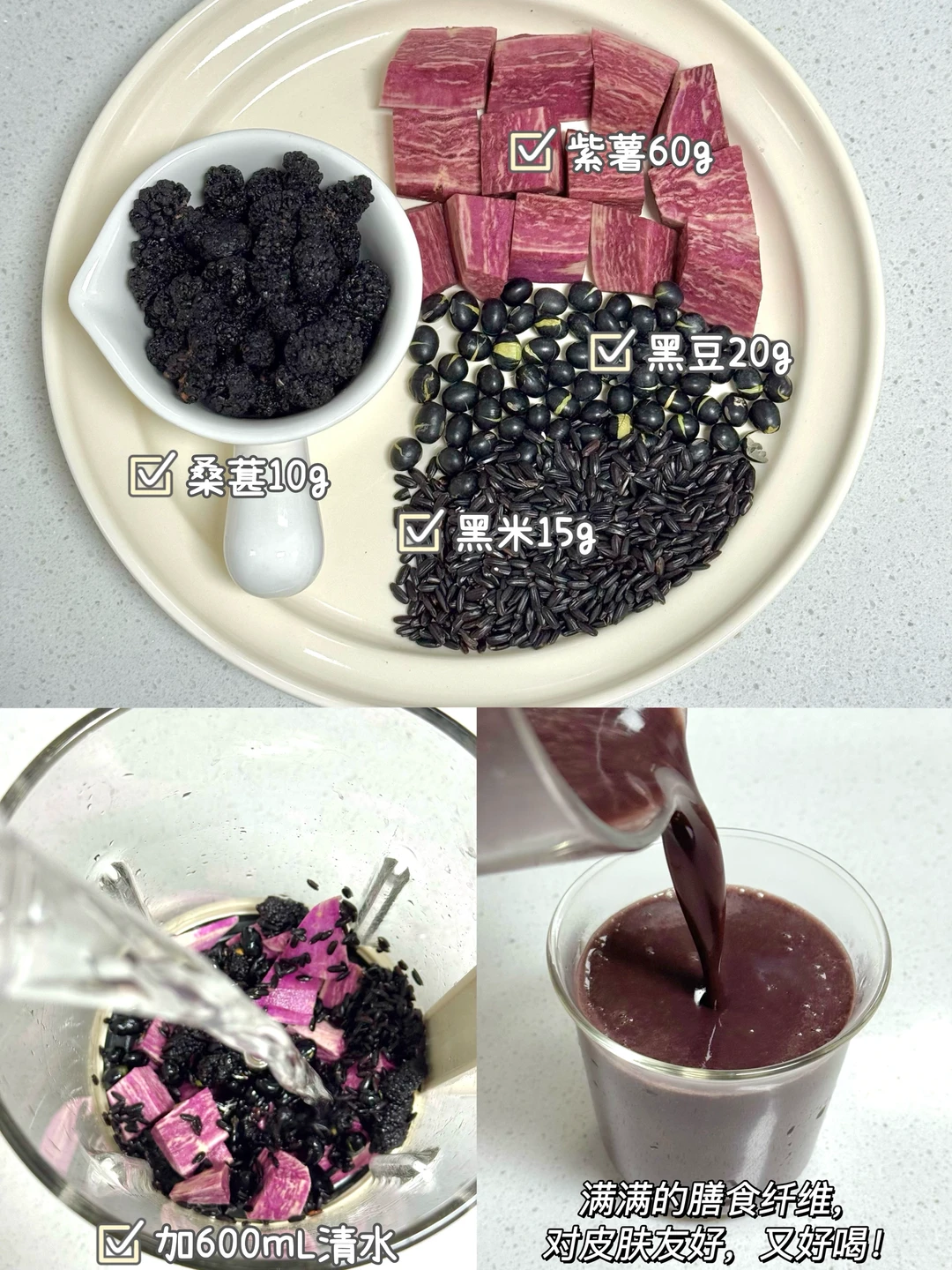 6️⃣桑葚干10g➕紫薯60g➕黑米15g➕黑豆20g➕适量冰糖➕600mL清水(桑葚紫薯豆浆,2人量)
