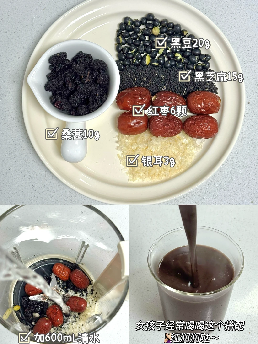 3️⃣桑葚干10g➕黑豆20g➕黑芝麻15g➕银耳3g➕红枣6颗➕600mL清水(桑葚银耳豆浆,2人量)