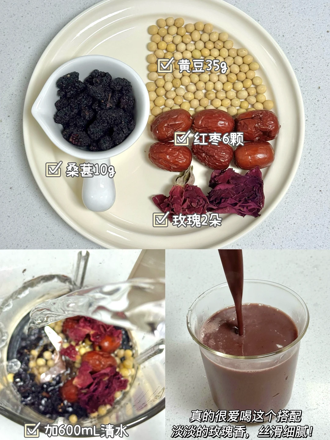 5️⃣桑葚干10g➕黄豆35g➕红枣6颗➕玫瑰🌹2朵➕600mL清水(桑葚玫瑰豆浆,2人量)