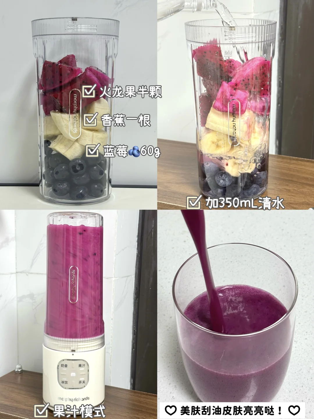 5⃣蓝莓➕香蕉➕火龙果➕清水(美肤刮油,让皮肤亮亮的)