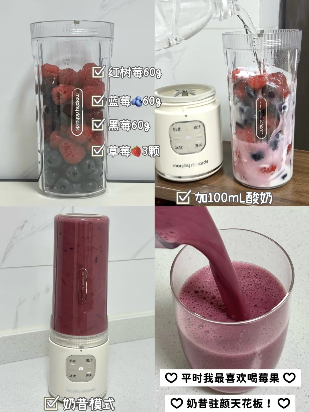 1⃣蓝莓➕树莓➕黑莓➕草莓➕酸奶(莓果奶昔,驻颜天花板)