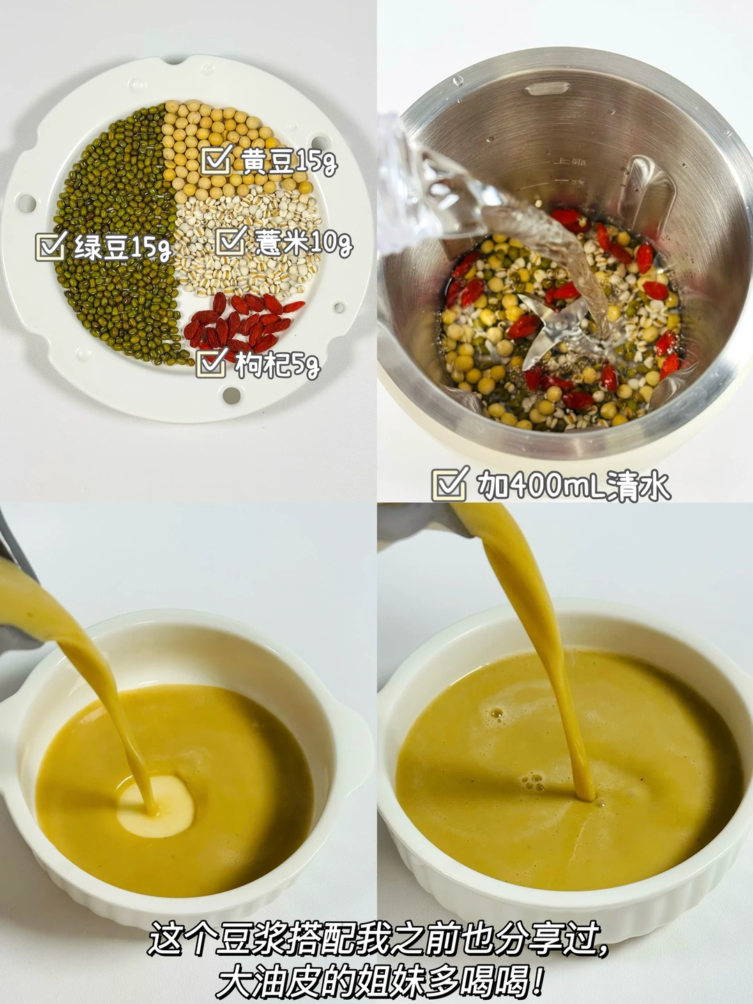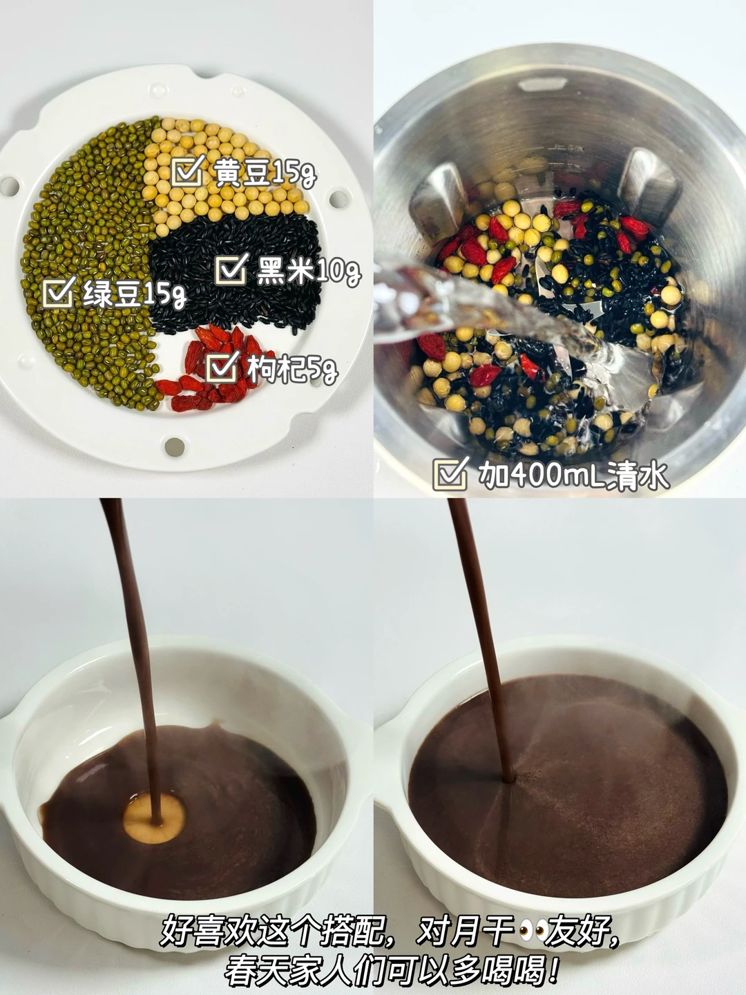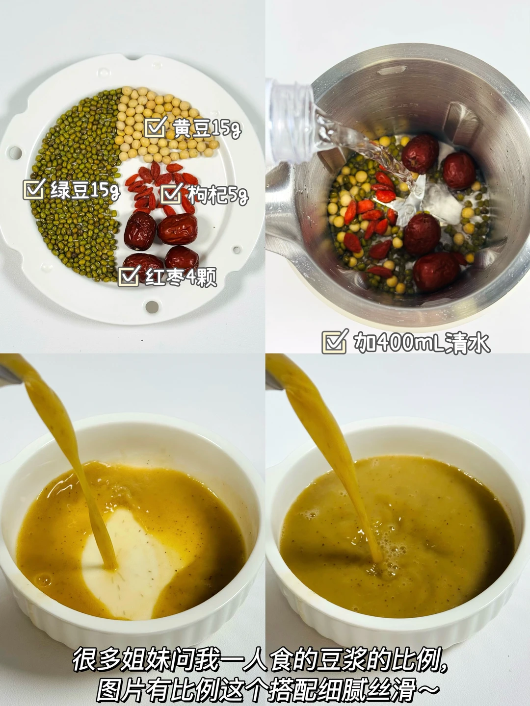 ✅做法:将所有食材放入破壁机中,(每款豆浆搭配放400mL清水,可以再加适量冰糖)豆浆模式即可!