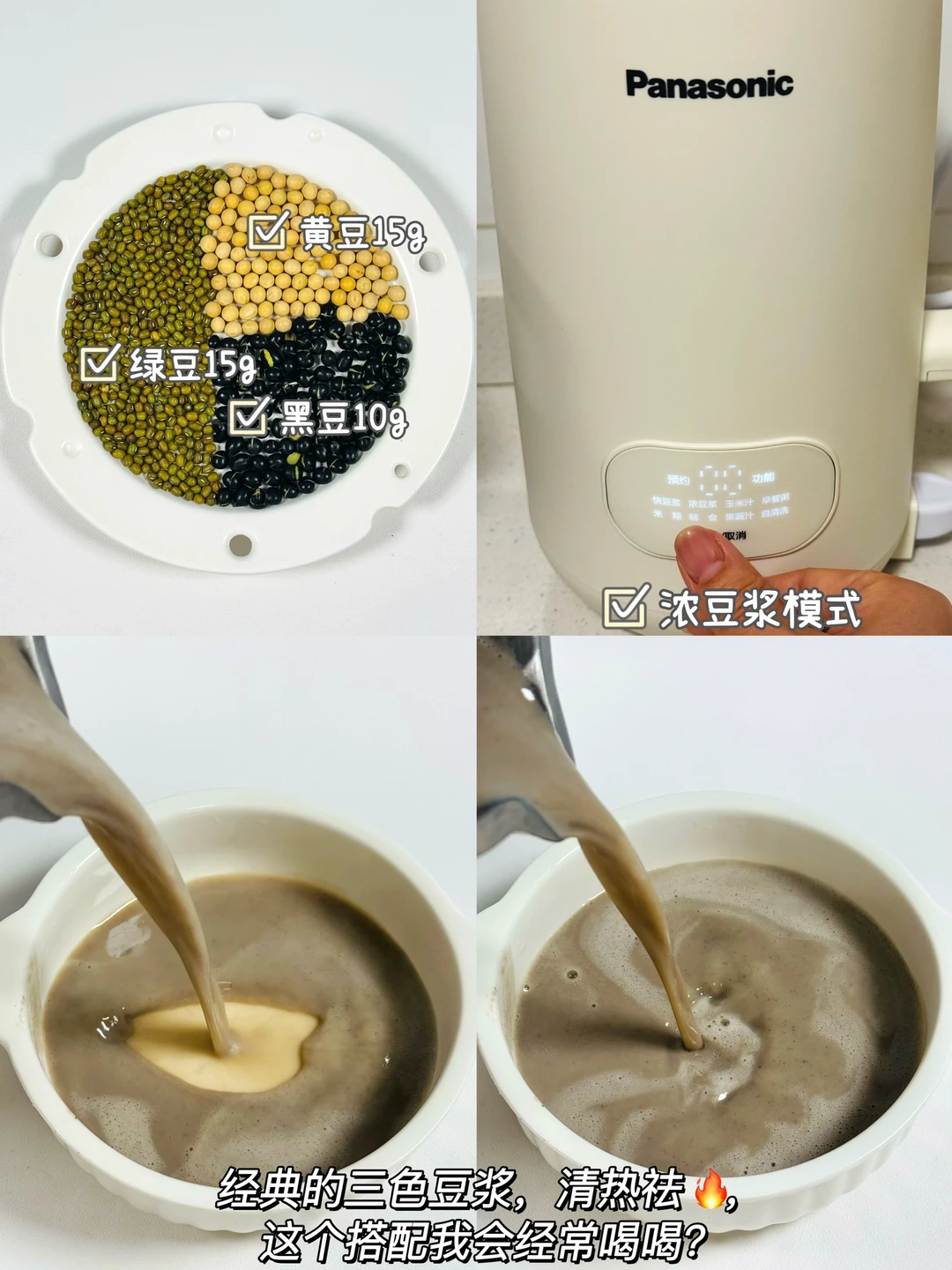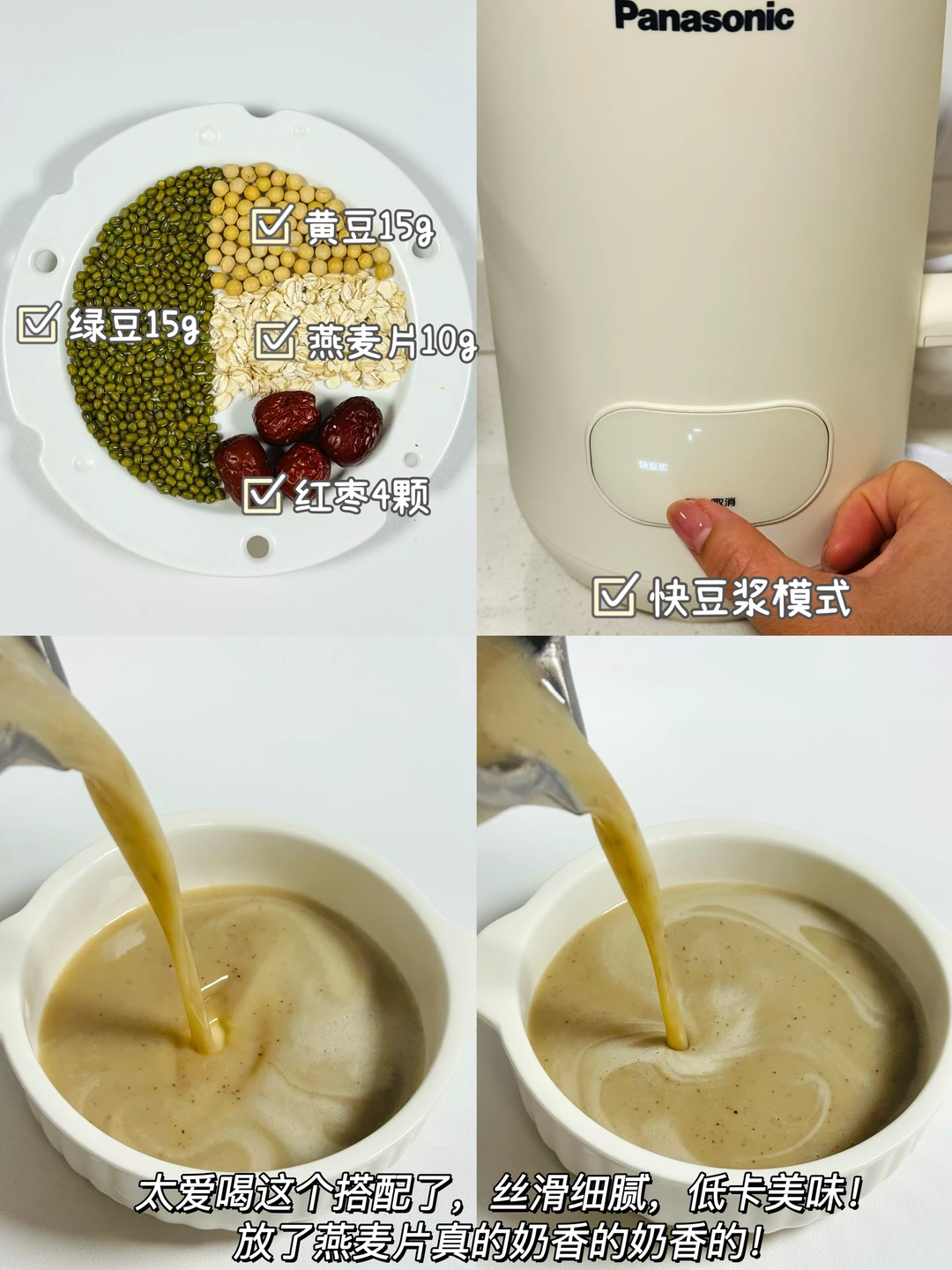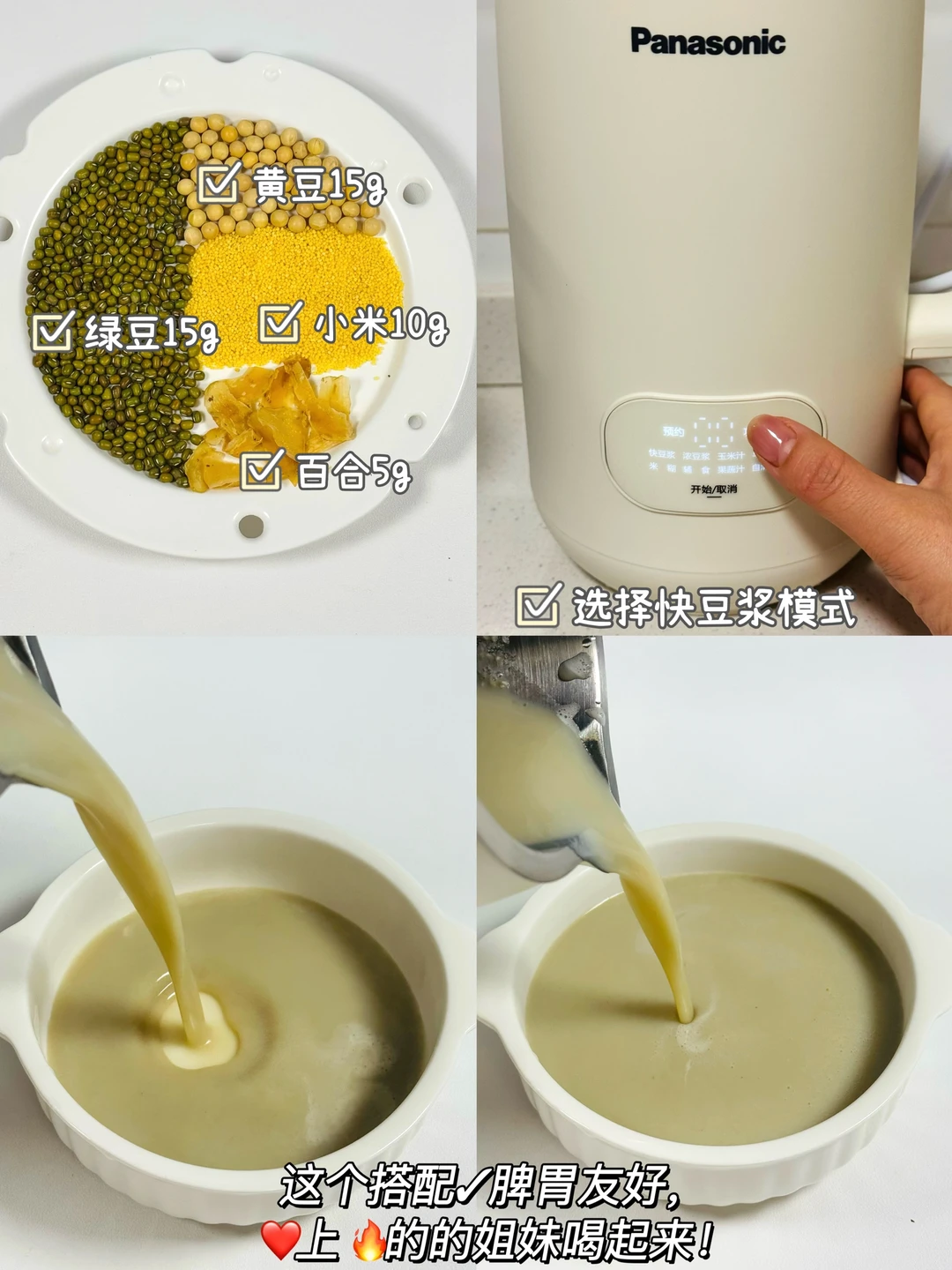✅做法:将所有食材放入破壁机中,(每款豆浆搭配放400mL清水,可以再加适量冰糖)豆浆模式即可!
