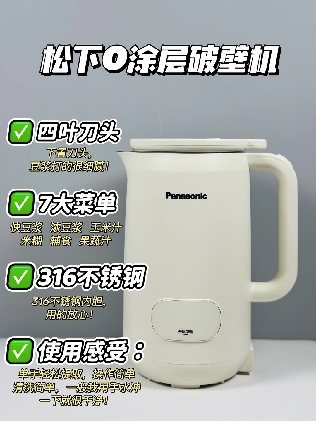🌈好多姐妹问我1人2人的小型破壁豆浆机有什么推荐的?这不这个松下新品0涂层破壁豆浆机。我替姐妹们试过了还不错!0涂层316L不锈钢,用的放心,双层防烫壶身,打豆浆声音也轻柔。四叶刀头豆浆打出来豆浆非常细腻丝滑。豆类都不用提前泡。功能比较齐全7种菜单满足日常生活用的,平时想榨果蔬汁,米糊,都可以!