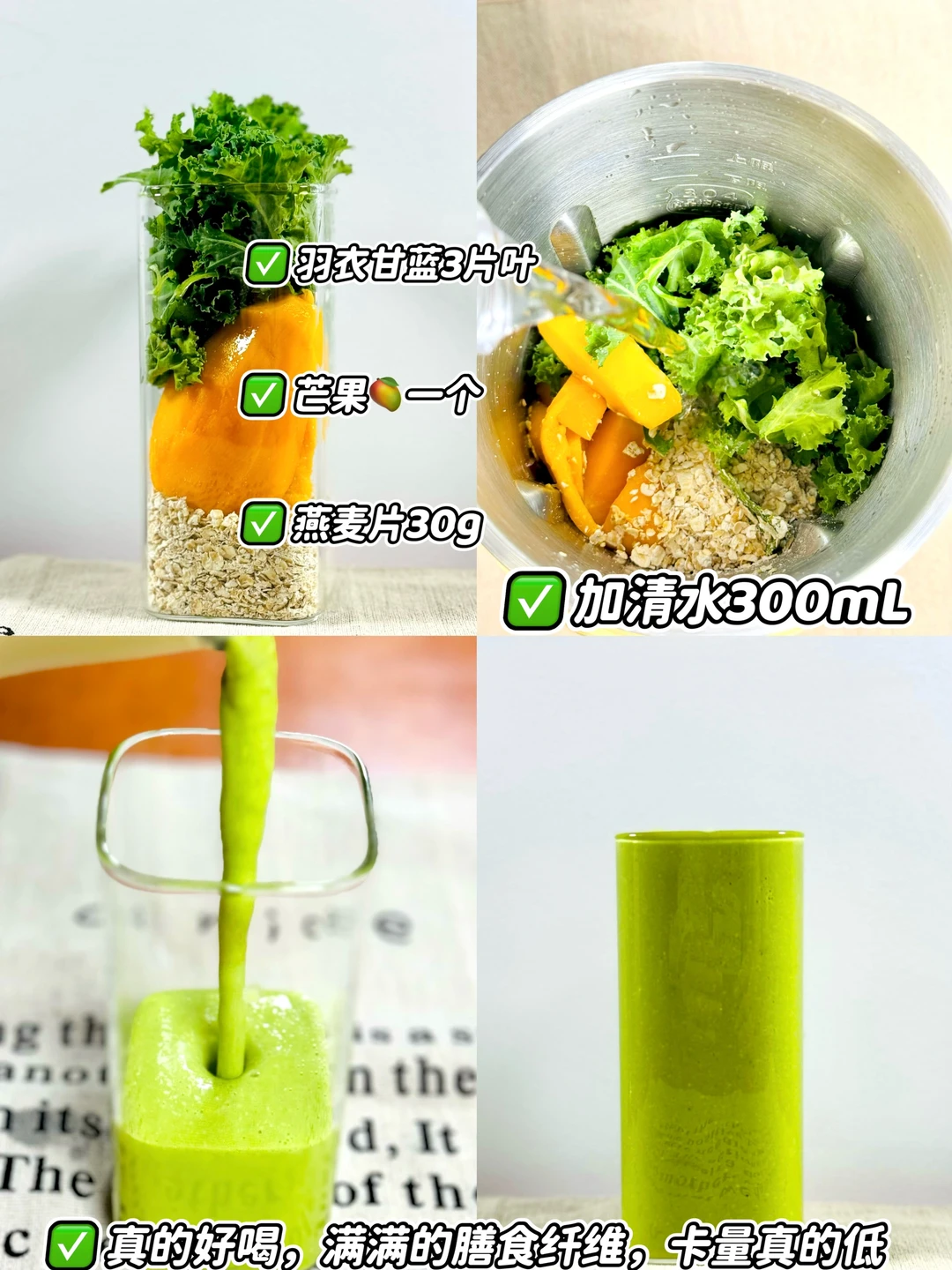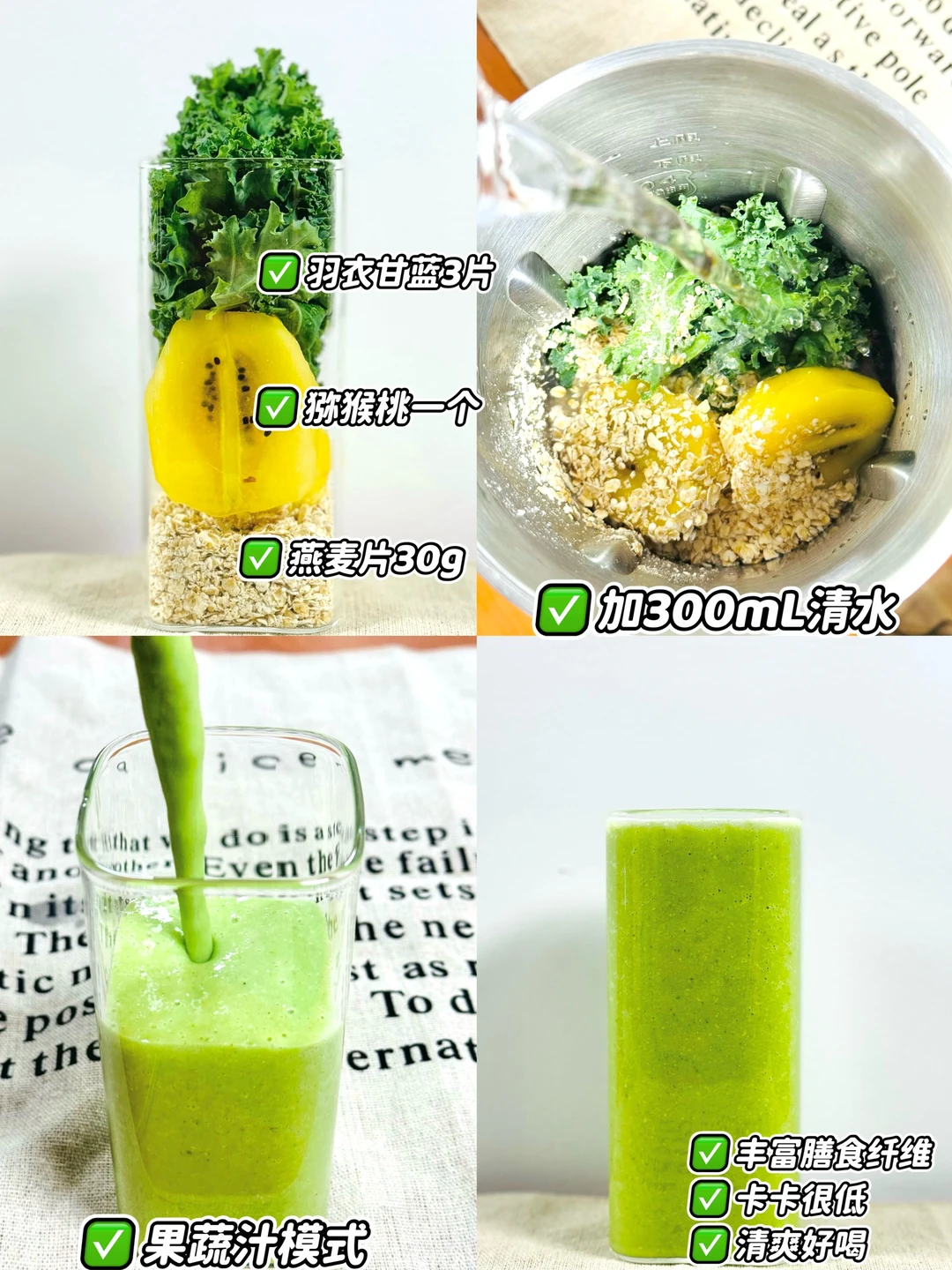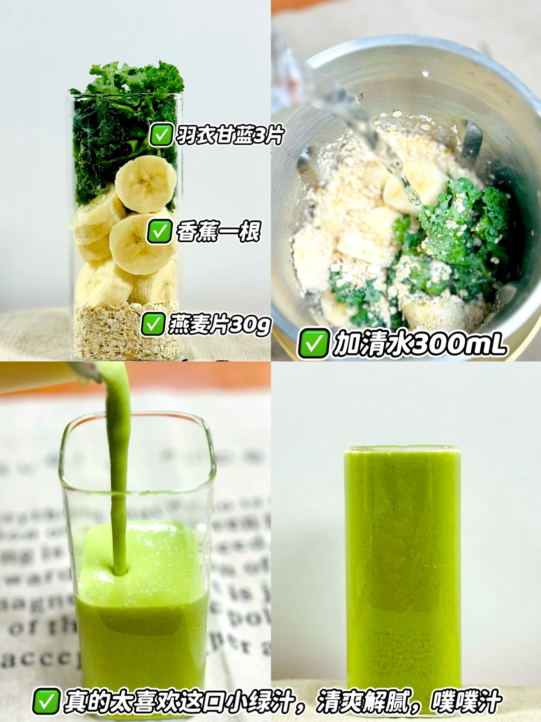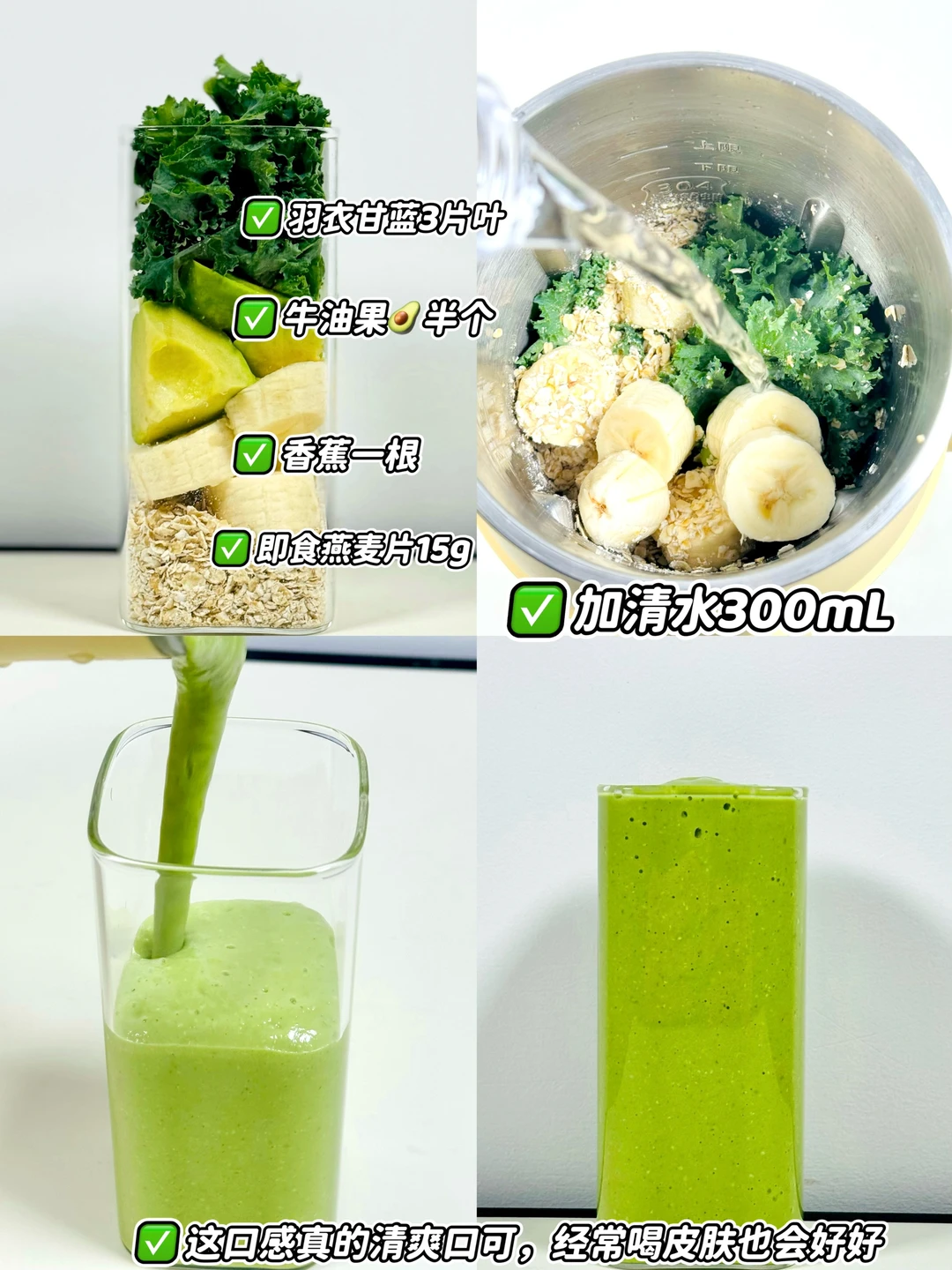 1️⃣羽衣甘蓝3片➕牛油果🥑半个➕香蕉🍌一根➕即食燕麦片15g