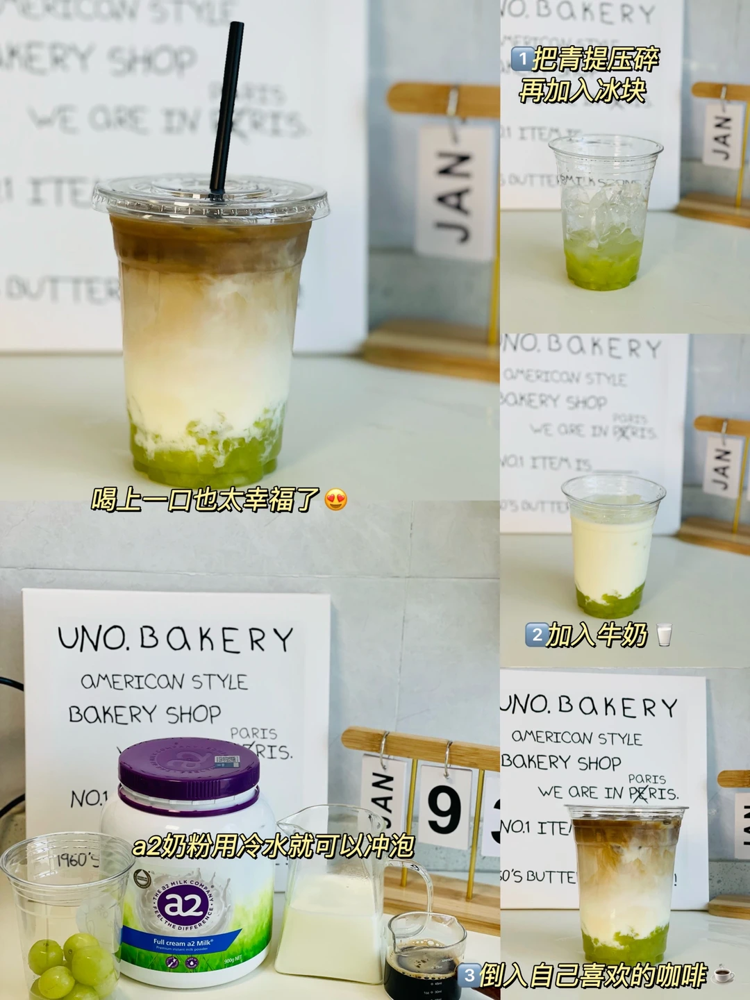 青提压碎➕冰块再倒入牛奶和咖啡即可,好喝又清爽的初恋青提拿铁就出炉了[斜眼R]