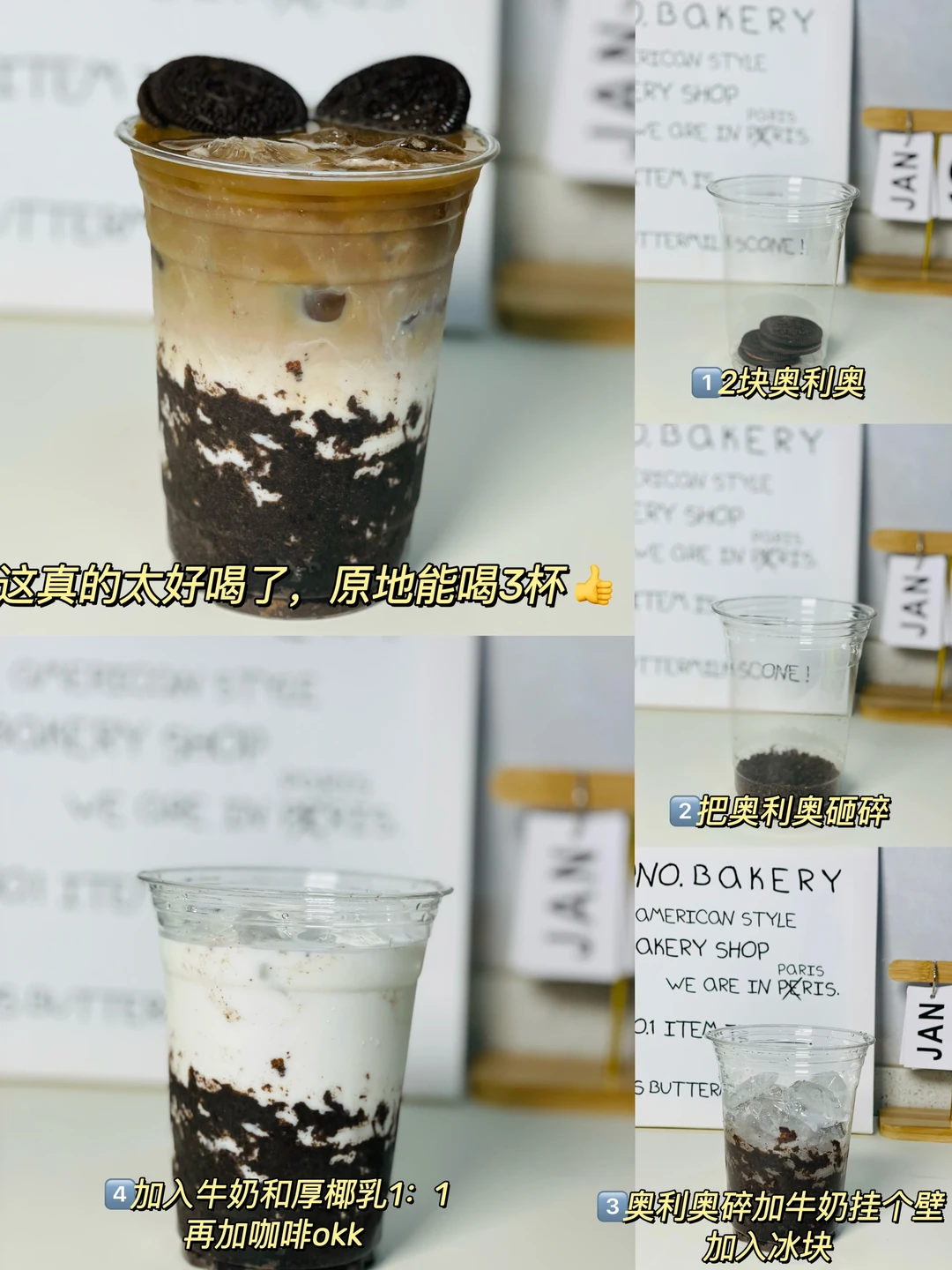 奥利奥砸碎,加少许牛奶挂个壁,倒入牛奶和厚椰乳(1:1)最后倒入咖啡,这杯真的太好喝了绝绝子🫶