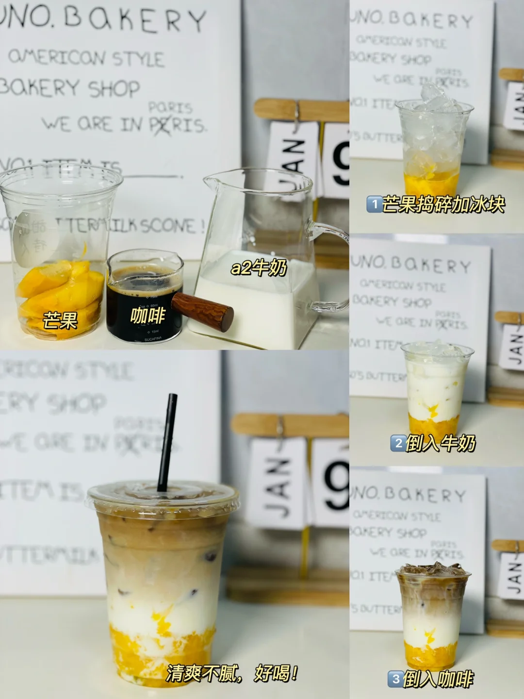 芒果压碎➕冰块和牛奶最后倒入咖啡即可!(自己想的名字哈哈哈哈哈)