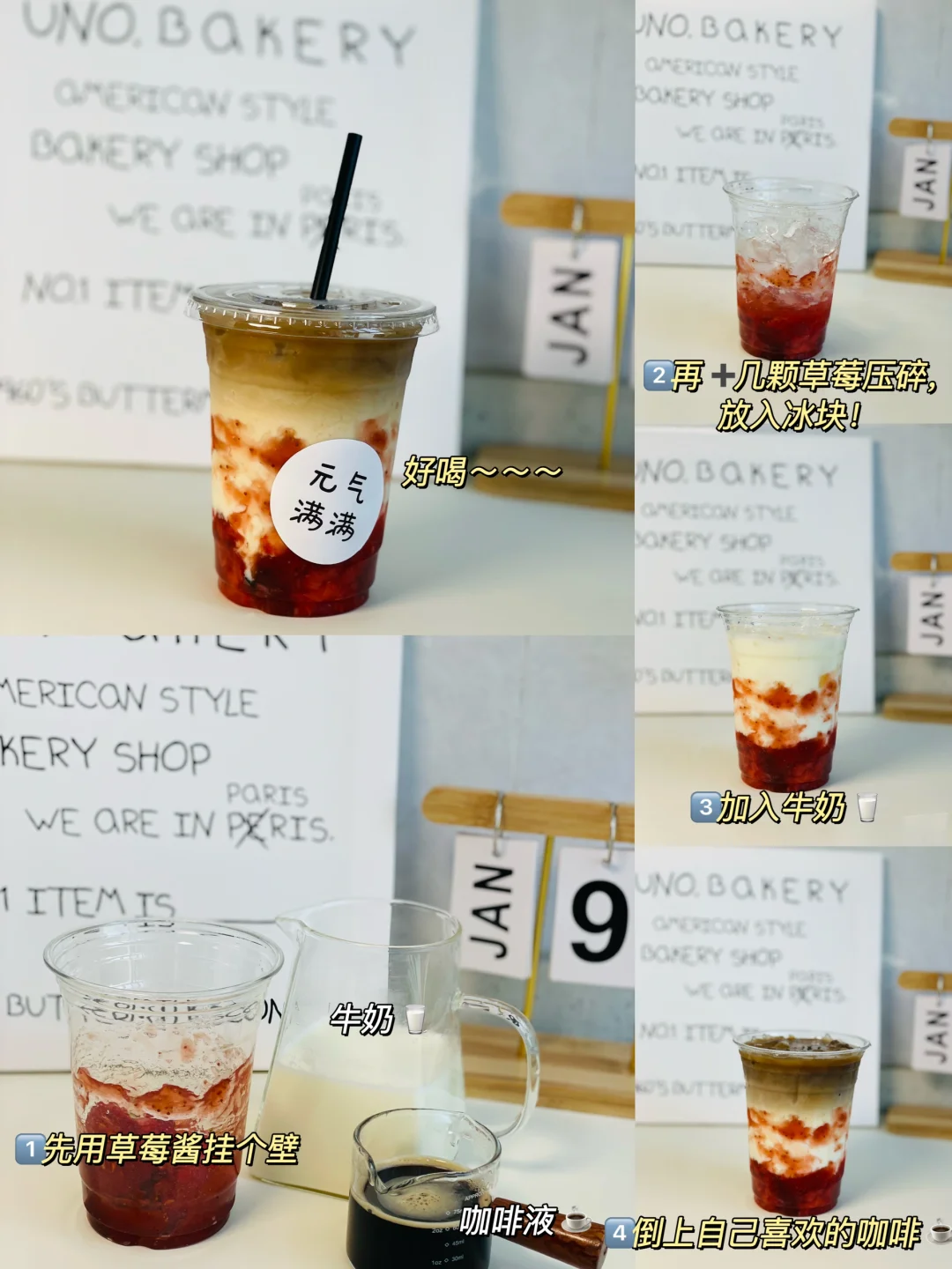 先用草莓酱挂个壁,再放几颗草莓🍓压碎,加入冰块倒入牛奶🥛,最后倒入咖啡液既可!好喝!