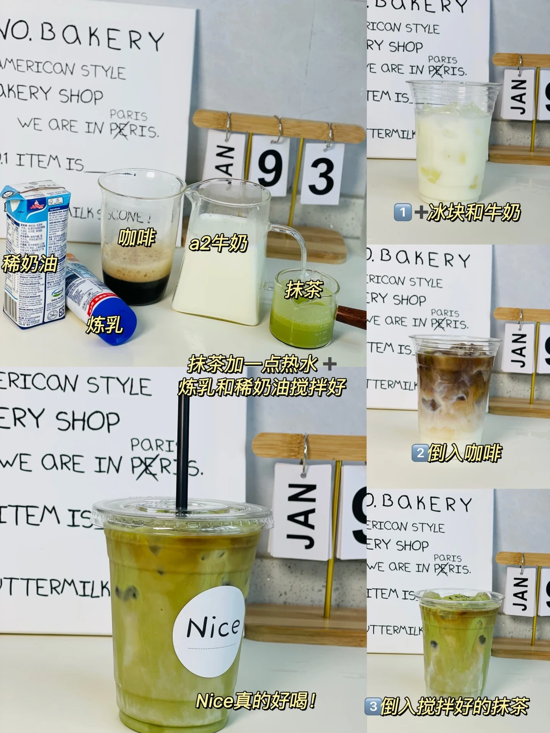 先抹茶粉加点热水炼乳和淡奶油搅拌备用,杯子放冰块牛奶倒入咖啡,最后倒入搅拌好的抹茶即可,这辈抹茶风味拿铁真的太好了🫶