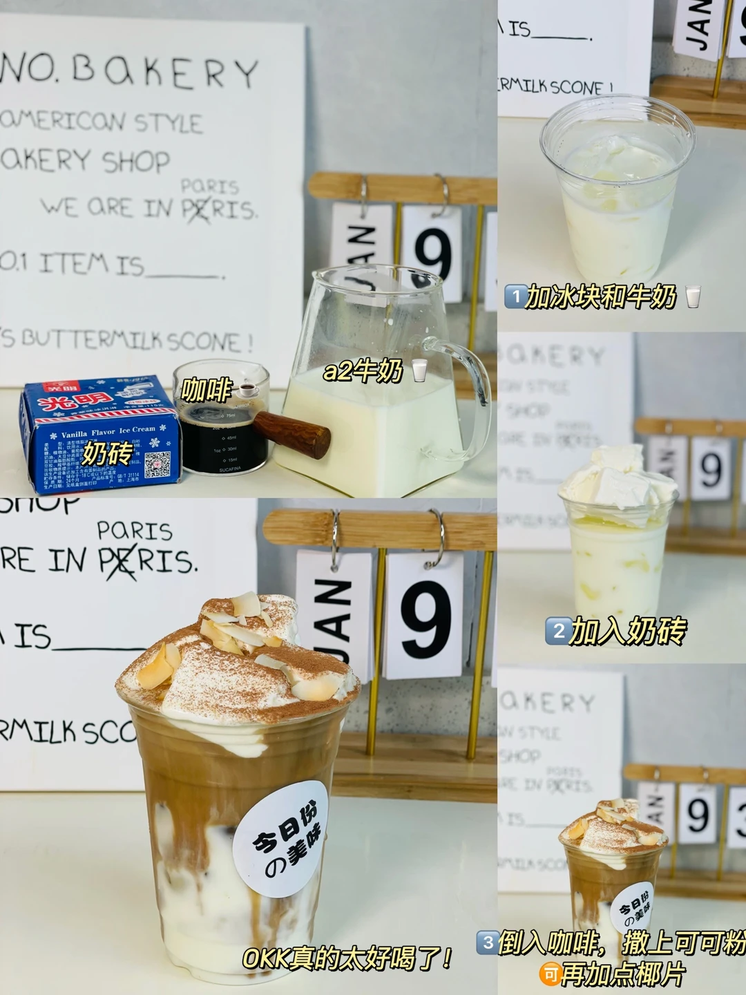 ➕冰块和牛奶,再➕奶砖,倒入咖啡也,撒上可可粉和椰片okk好喝奶味十足的冰奶砖可可拿铁就出炉了[斜眼R]