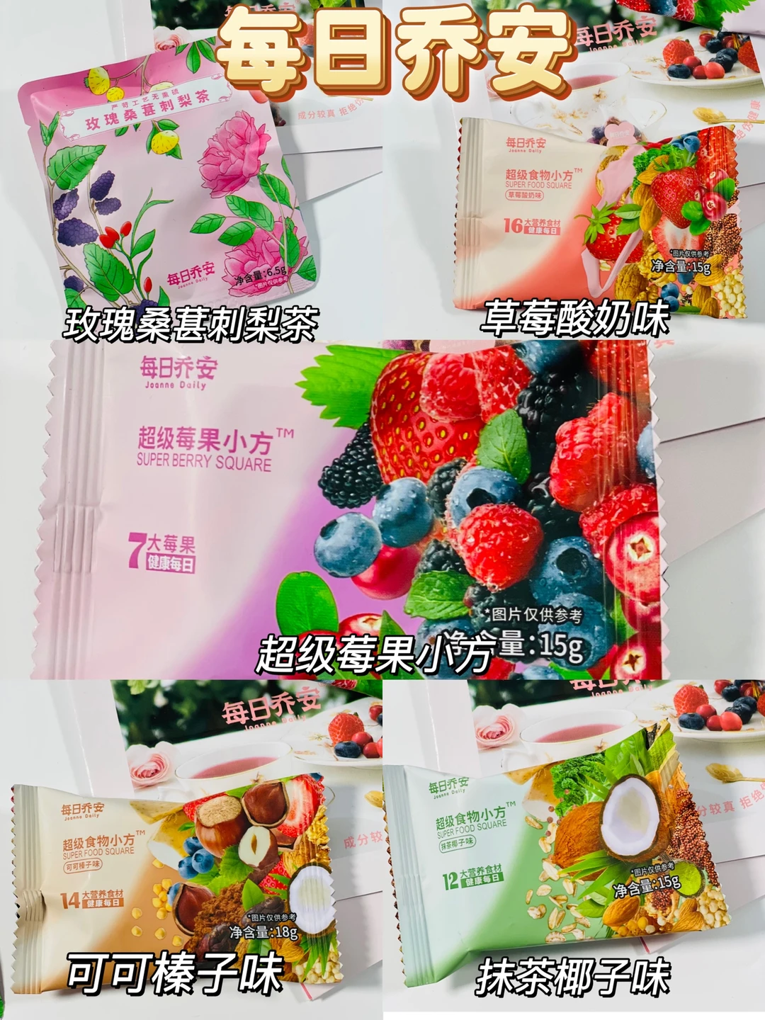 💯 强烈推荐每日乔安的玫瑰桑葚刺梨茶,真的好喝,姐妹们卷起来,方便携带,上班,旅游都可以放包里。都不用自己搭配,怕配比不好,太太太省心了❗ 💯还有她家的超级莓果小方,超级食物小方太好吃了,最近放包里,都被同事抢去吃,都来问我在哪买这么好吃的零食[害羞R]。关键真的非常健康,营养! 🌈不信你们去吃,不好吃来找我[害羞R]