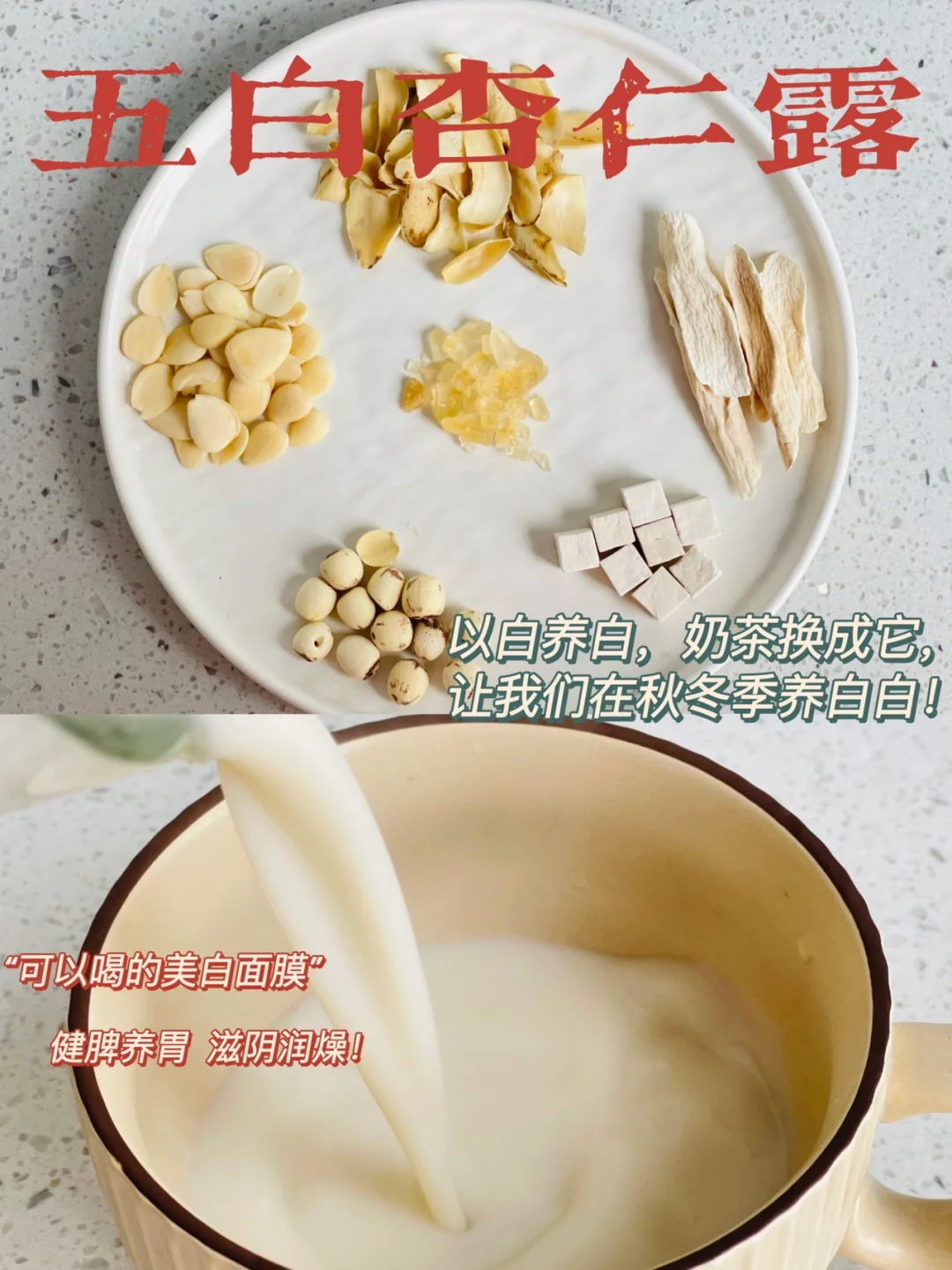 ✅秋冬可以多喝这款五白杏仁露,以白养白,把奶茶都换成它,一定牢牢的记住这配比,(南杏仁可20g)记不住可以点赞➕收藏,让我们一起做个白白的小仙女🤭。小姐姐们一定要把图片看到最后哦! ✅ 南杏仁➕百合➕莲子➕怀山➕茯苓 ✅ 做法:将所有食材清洗干净放入破壁机中, ➕600ml清水,豆浆模式即可! 🌈 健脾养胃 | 滋阴降燥 | 美白润肺 | 养心安神 | 🌈早餐来一杯,加上我做的早餐,老公直夸绝绝子[害羞R]