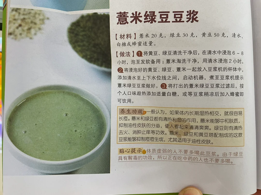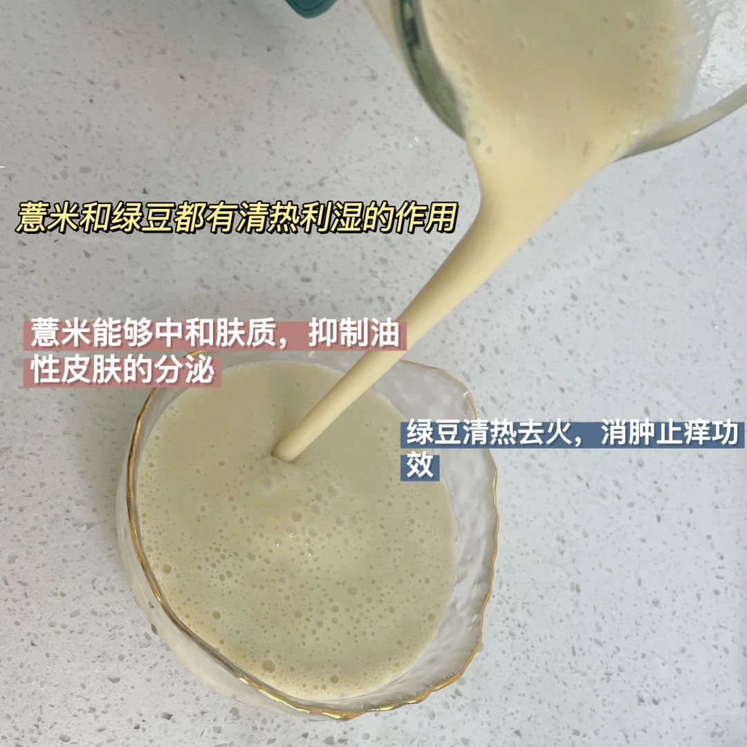 !一般认为,如果体内长期湿热相交,就很容易长痘,薏米绿豆都有清热利湿的作用,薏米能够中和肤质,抑制油性皮肤的分泌,使人看起来清清爽爽。绿豆则有清热去火,消肿止痒等功效。薏米、绿豆和黄豆搭配配置成的这款豆浆能够抑制痘痘生成,尤其适用于油性皮肤。