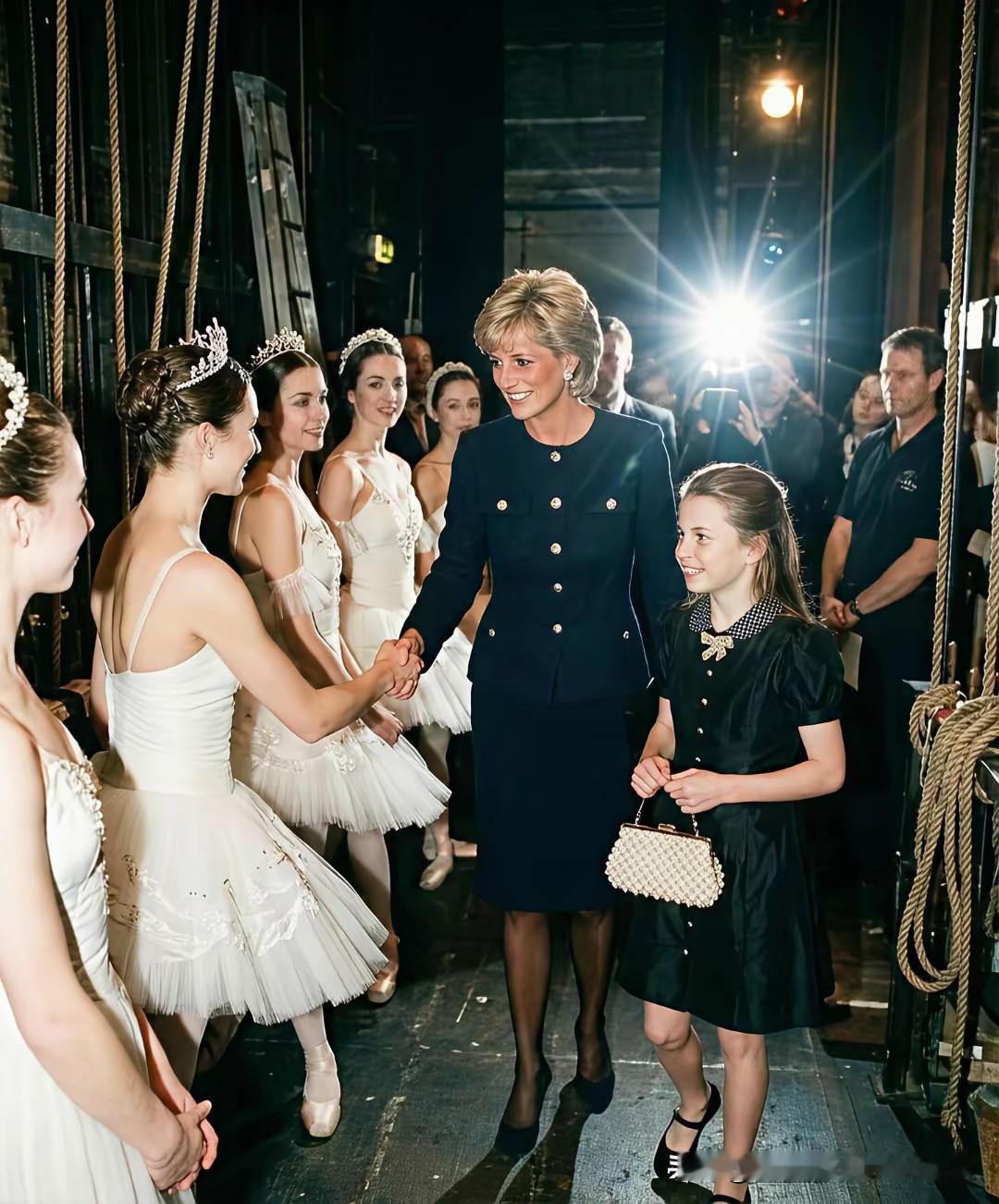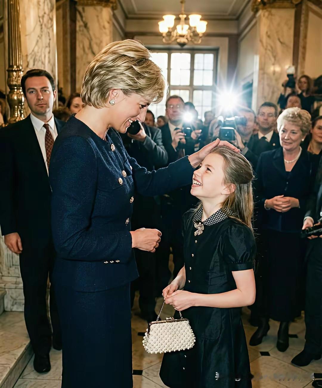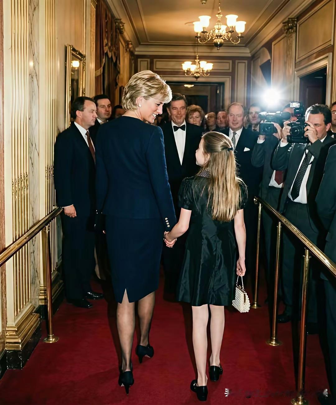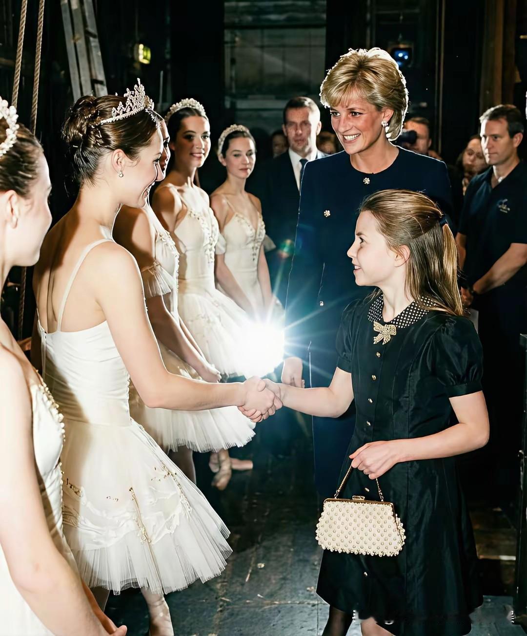 这一定是大家最想看到的画面,戴安娜王妃和孙女夏洛特公主! 捕捉到了一组来自网上的关于戴安娜王妃和孙女夏洛特公主的同框照片,虽然是网友AI生成的,但是却也是喜欢这对王室祖孙俩的粉丝最想看到的画面。 戴安娜王妃和夏洛特公主同样穿着一袭黑裙,祖孙俩手牵着手一起去看芭蕾舞表演,戴安娜王妃牵着孙女的手,不时给孙女整理衣襟,笑得一脸宠溺。 而乖巧可爱的夏洛特公主,笑得甜美可人,望着祖母戴安娜王妃的眼神,也满满都是对祖母的孺慕之情!